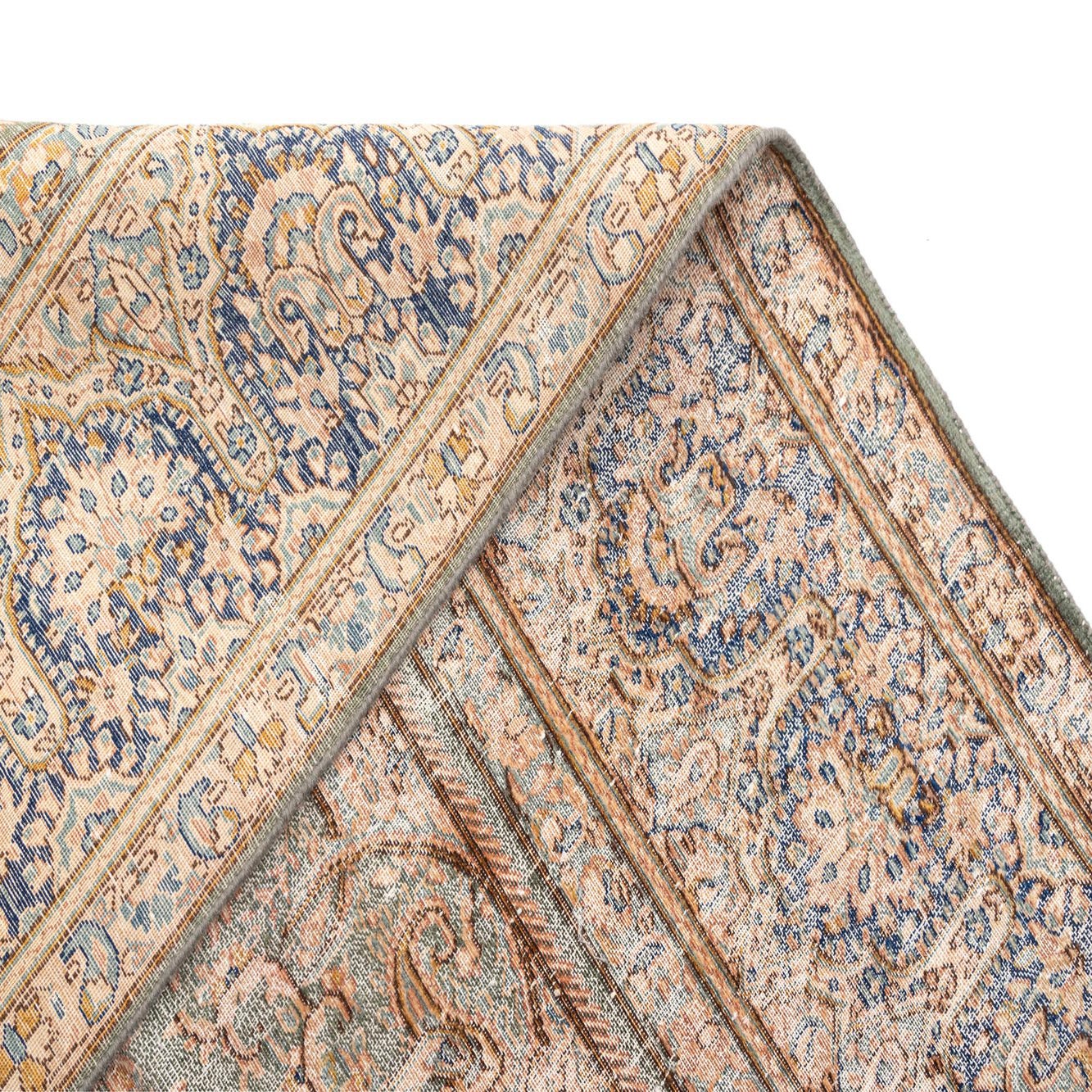 Given the rug's classic pattern and muted color scheme, it would be well-suited for a traditional living room, dining room, or a spacious bedroom. It could also complement an office or study, adding a touch of elegance without overwhelming the space. The natural colors and timeless design make it versatile for coordination with a variety of furnishings and décor themes, from antique wood pieces to more contemporary furniture with clean, simple lines.