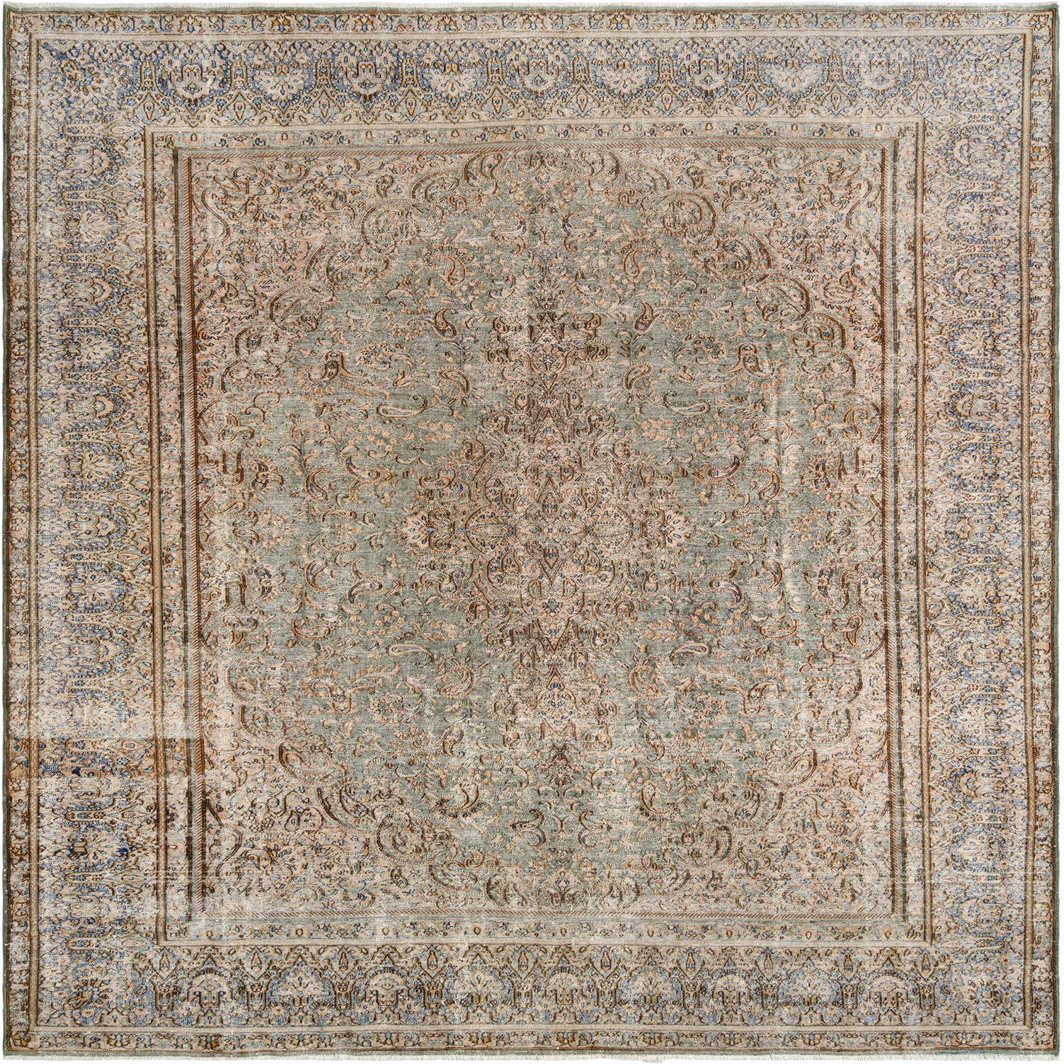 A large 9x12 rectangular Persian rug with a faded brown and tan floral pattern on a light blue-green background.