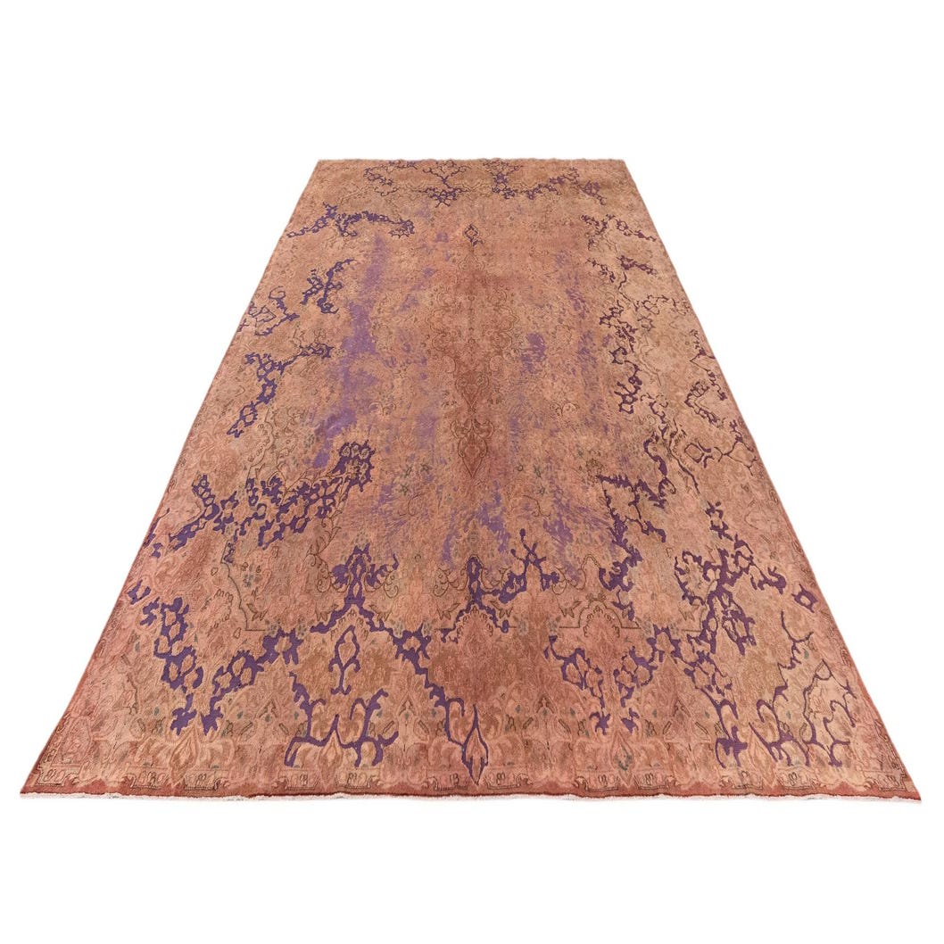 A 9x12 rectangular Persian rug in brown and tan with distressed purple accents, suitable for a living room.