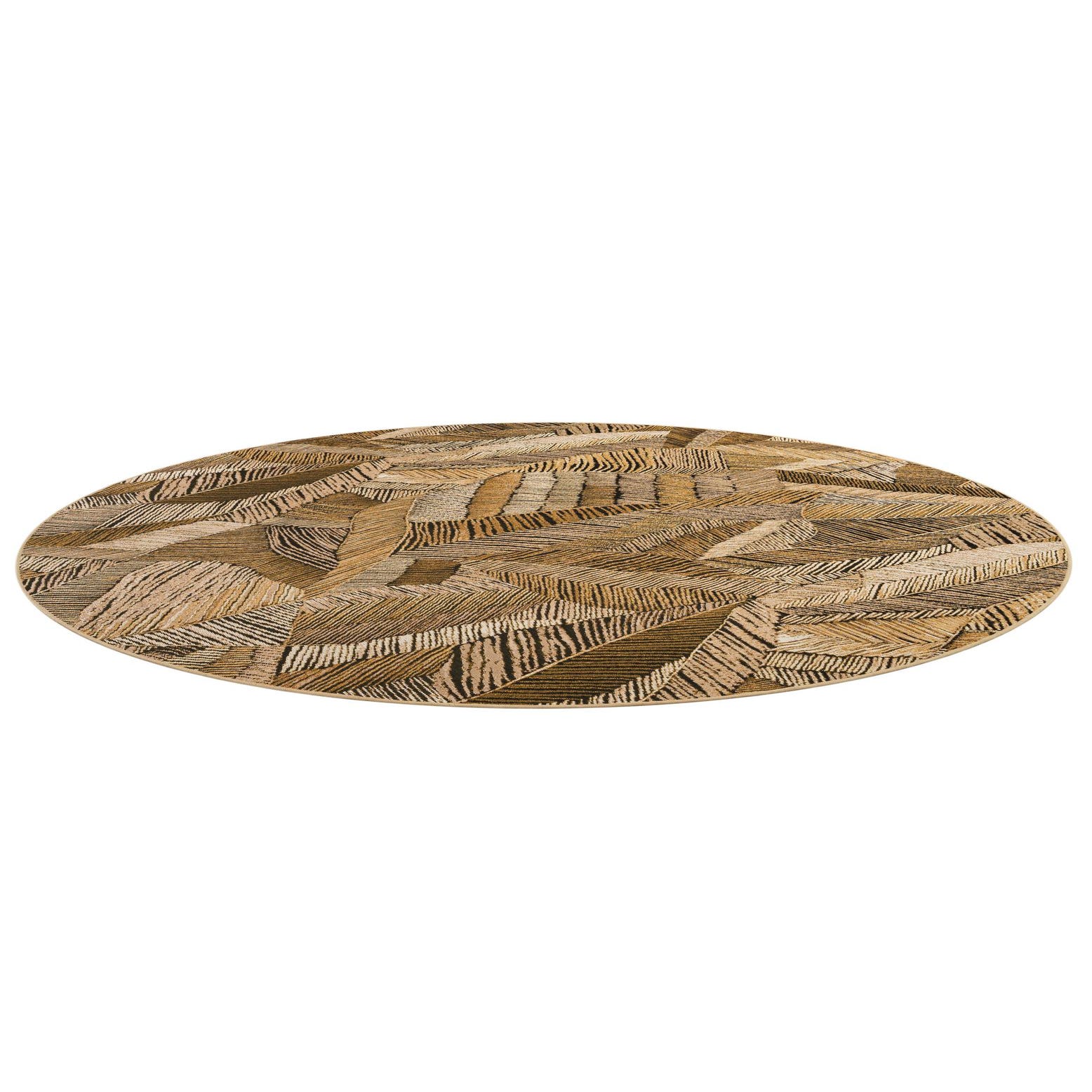 A layered botanical pattern of overlapping leaves gives this round rug a natural, sculptural presence. Striated lines and alternating pile directions create a sense of movement and subtle depth across the brown-and-beige background, while warm yellow accents pick out select leaf details. The surface has a low-profile texture with a slightly crisp, defined feel from the machine-made construction—pattern definition is sharp and the color variations read as intentional dimension rather than flat printing.