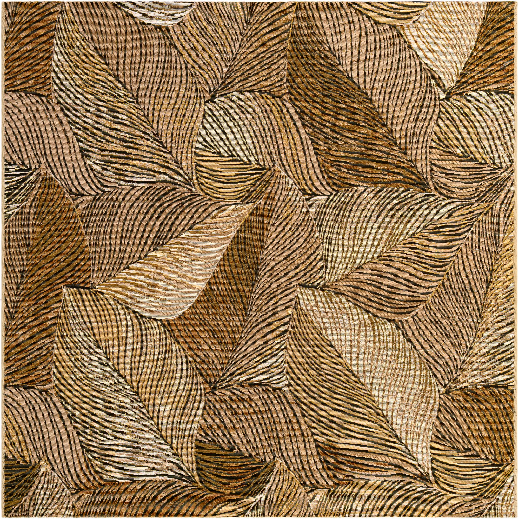 A 6'x6' square indoor/outdoor rug featuring a modern floral pattern of overlapping brown and tan leaves with dark vein details.
