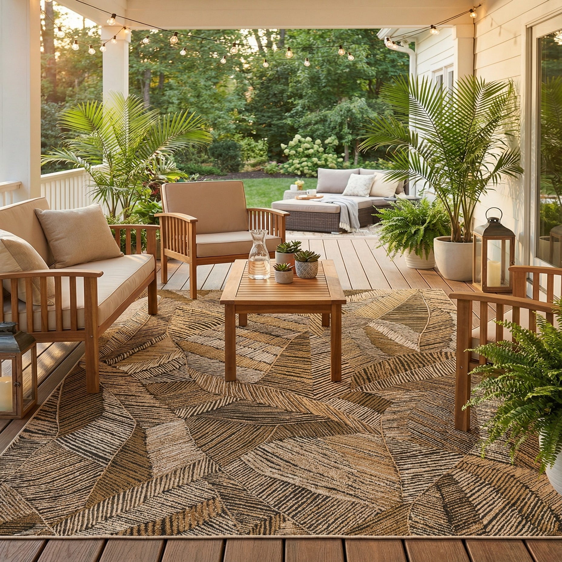 The surface feels slightly textured underfoot, with tight weaving and raised linear details that you can both see and feel. Its earthy palette and nature-inspired motif pair well with wicker or rattan seating, weathered wood dining sets, and neutral outdoor cushions. Use it to anchor a covered patio seating area, add warmth to a sunroom, or define a dining space on a screened porch; it complements casual, transitional, and modern organic interiors.
