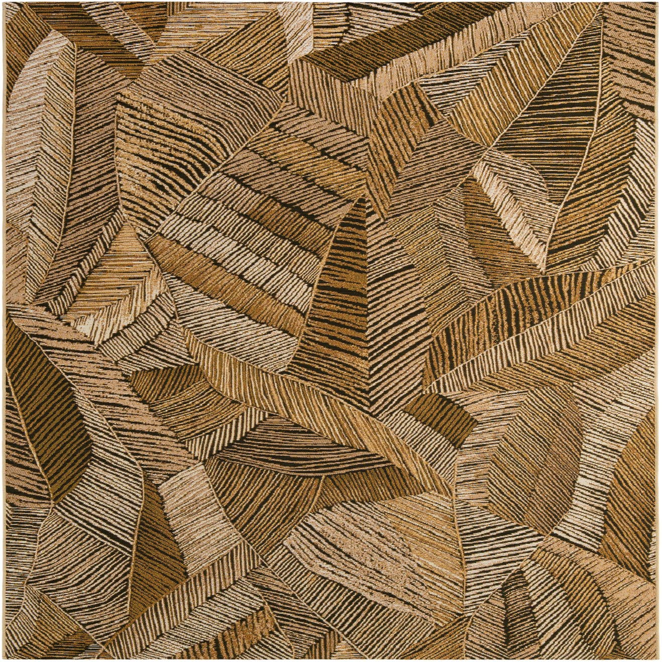 A layered botanical pattern gives this outdoor rug a lively, sculptural look. Overlapping leaf shapes are defined by fine linear hatching and directional striping, creating movement across a brown-and-beige background with olive and yellow accents. The machine-made construction (75% polypropylene, 25% polyester) produces crisp pattern definition and colors that hold up to outdoor exposure while keeping the surface low-profile and structured.