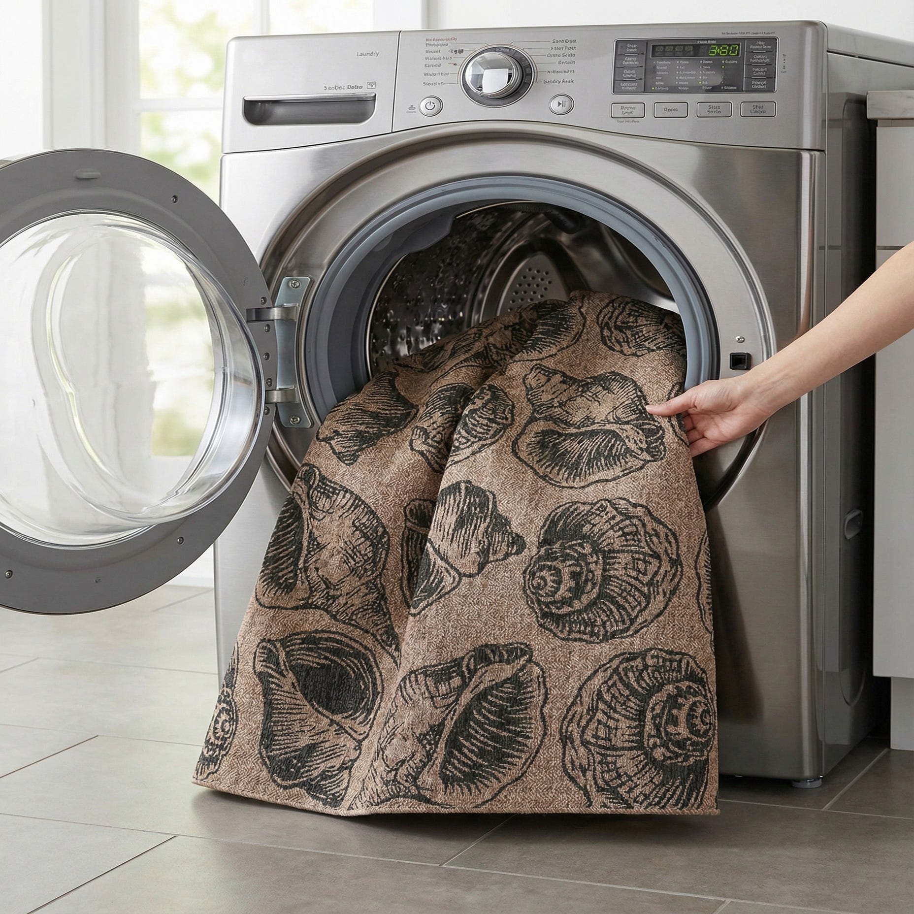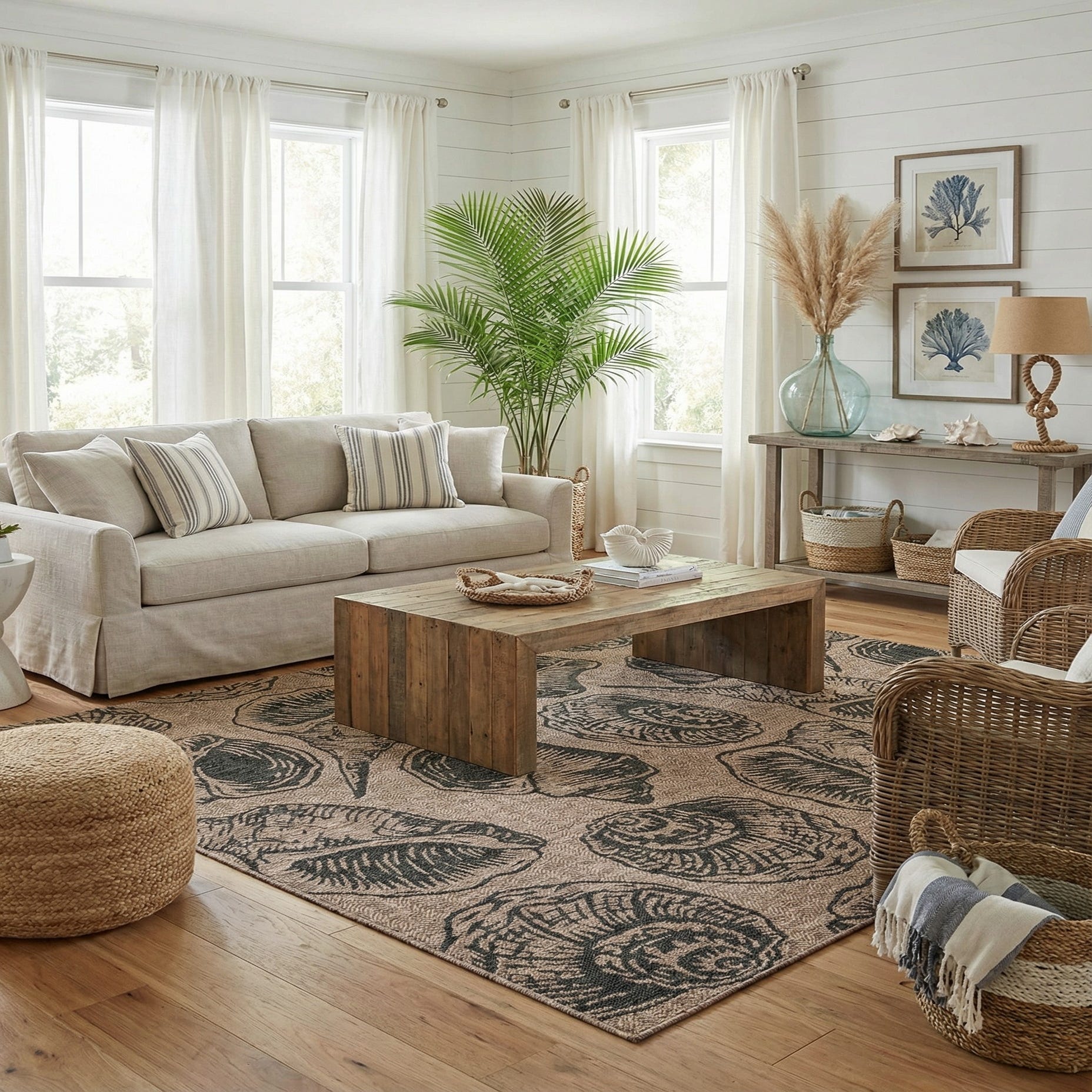 This rug works well in casual coastal and transitional settings: layer it under a sunroom seating group with wicker chairs and linen cushions, anchor an outdoor dining space paired with weathered wood furniture, or place it in an entryway to set a relaxed, beach-inspired tone. Its neutral brown and black palette pairs easily with navy, soft whites, and natural wood finishes, making it a versatile choice for patios, covered porches, or relaxed living areas.