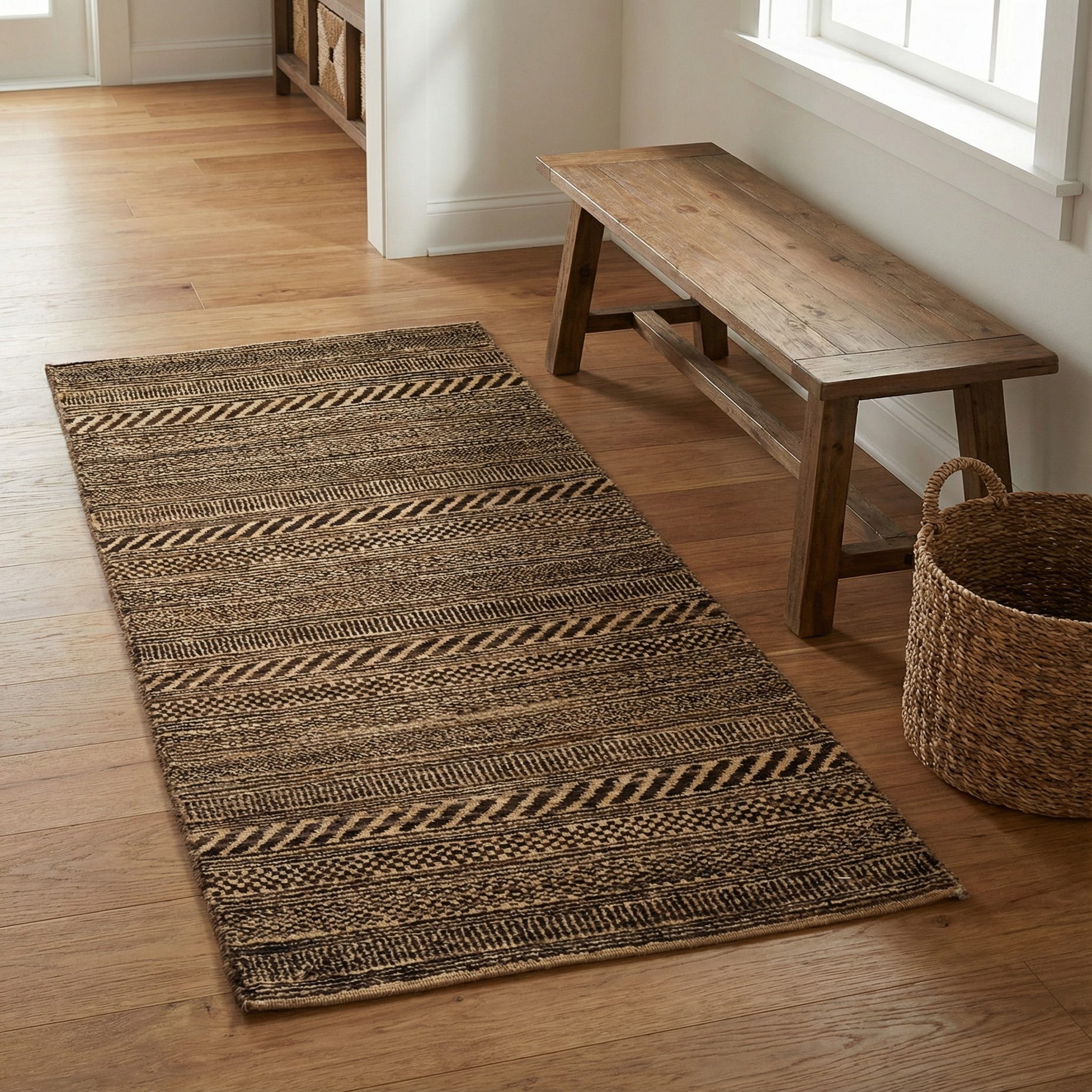 Hand-knotted from 100% wool, this runner has a dense, tactile pile that feels warm and substantial underfoot. The surface shows a series of horizontal bands made up of tight, small-scale motifs — diagonal stripe bands, narrow ribbed lines and tiny checker-like dots — that create a quietly rhythmic pattern across the length of the rug. A warm brown ground is threaded with ivory highlights and deeper brown accents, giving the design clear definition and a layered, handcrafted look.