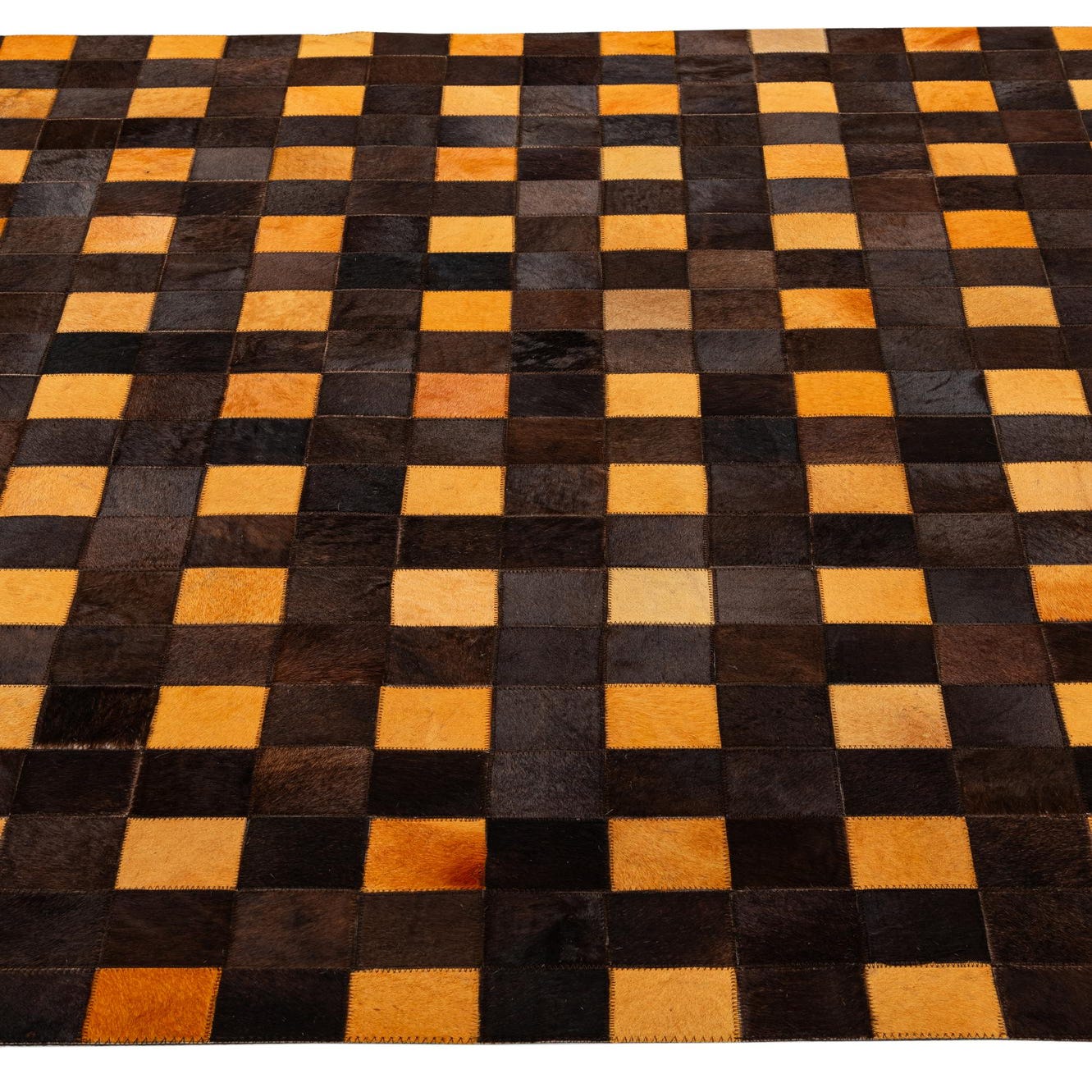A 5x8 rectangular brown and orange modern cowhide rug with a checkerboard patchwork pattern, ideal for a living room.