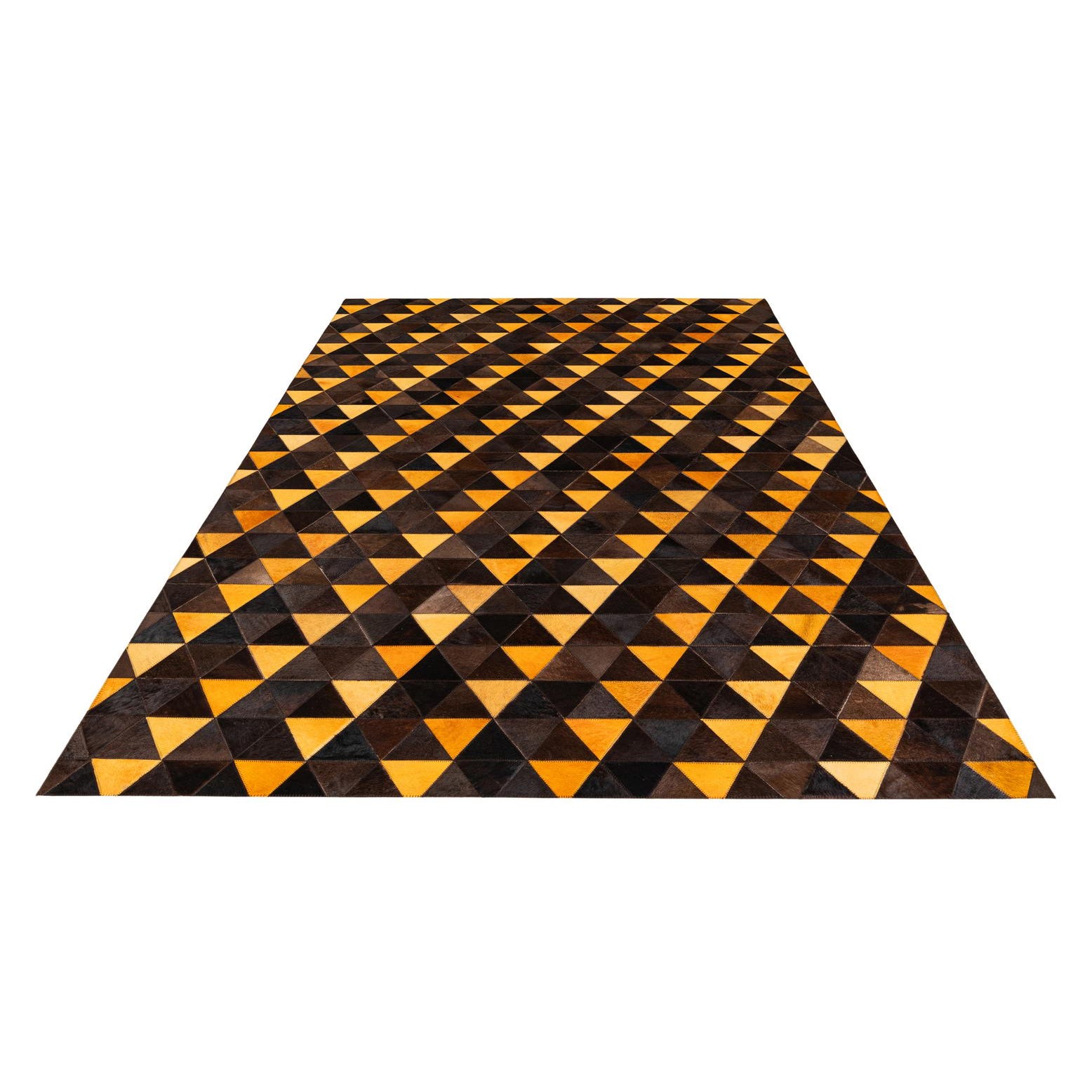 A 5x8 rectangular Cowhide Stocks rug featuring a modern geometric pattern of alternating brown and orange triangles.