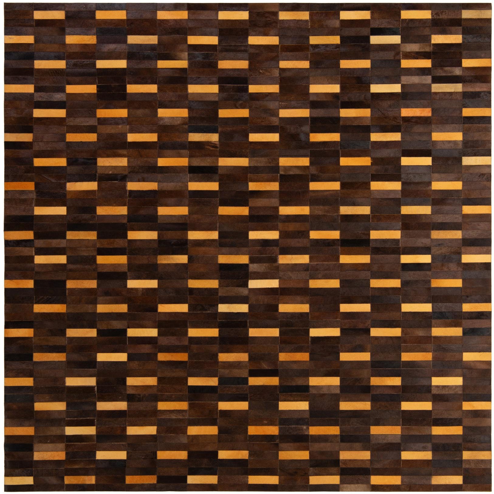 A rectangular 8x10 Cowhide Patchwork rug featuring a modern stripe pattern in varying shades of brown and orange.