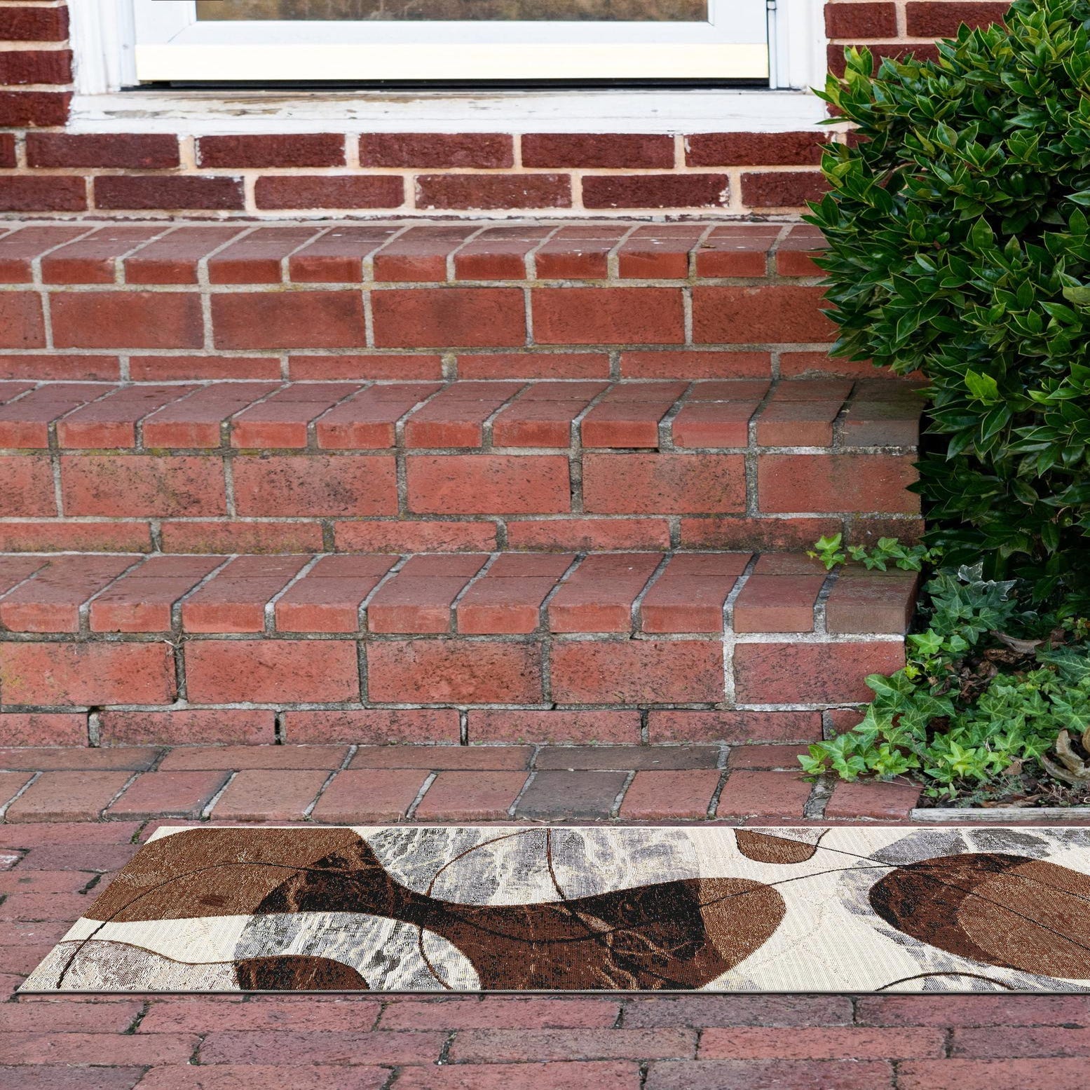 A brown, tan, and white 8 ft runner rug with an abstract modern pattern, suitable for a hallway or patio.