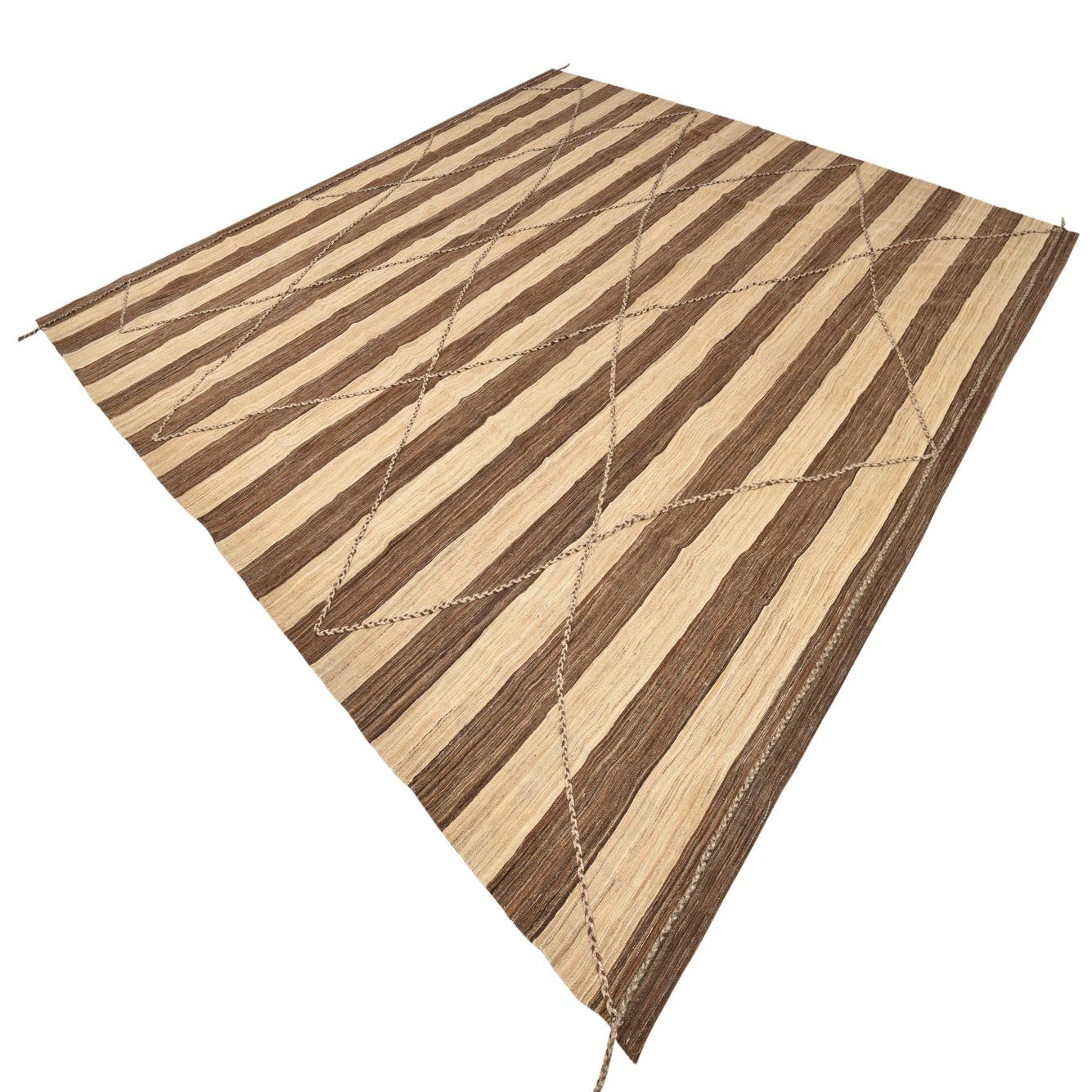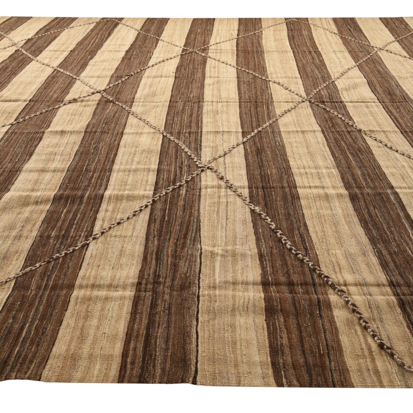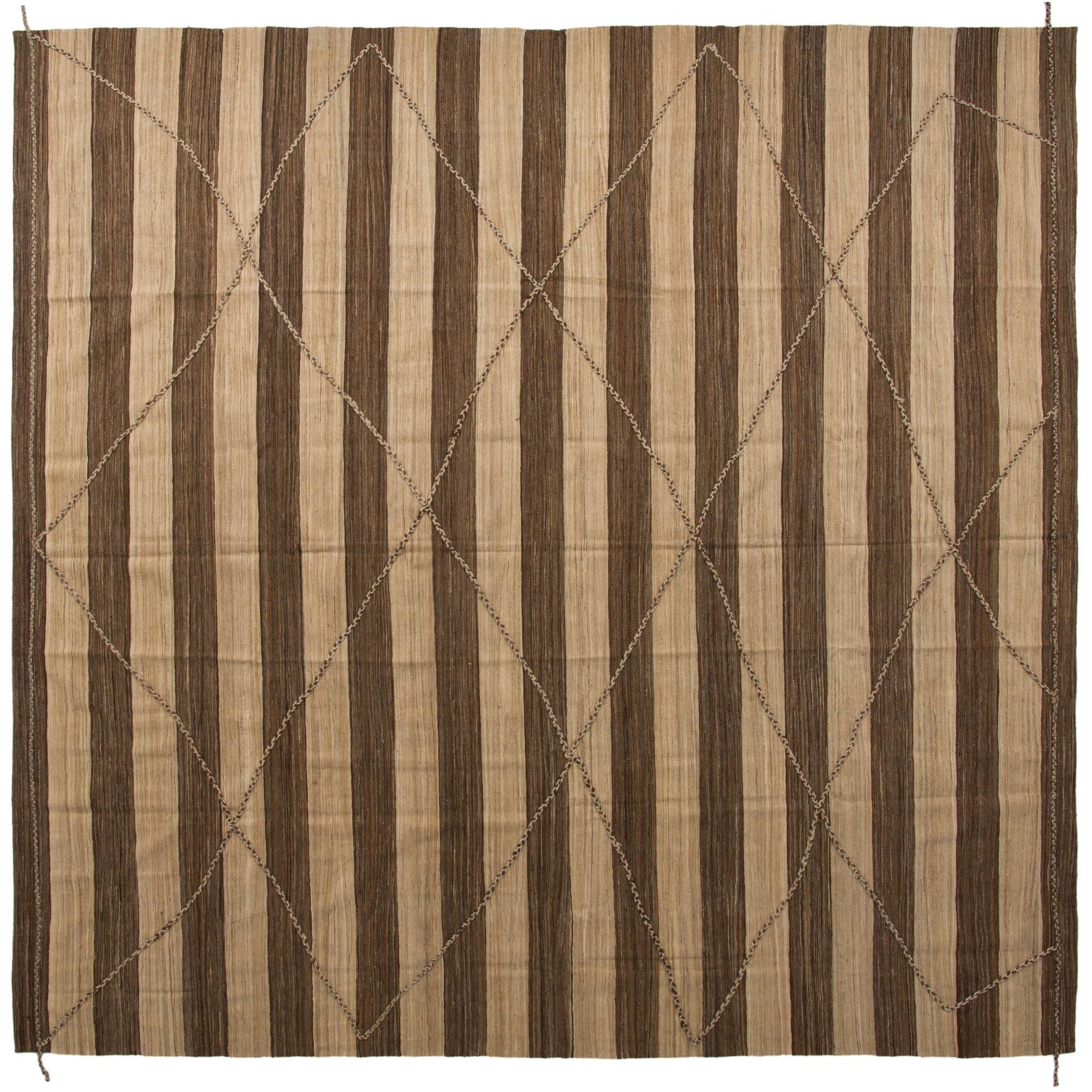 A large 13' 2 x 13' 8 square Moroccan shag rug featuring alternating brown and tan vertical stripes with a subtle diamond pattern overlay.