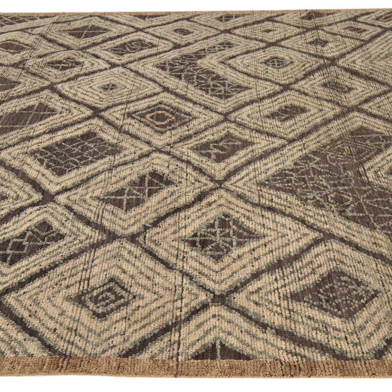 A rectangular 8x10 Darya rug with a modern abstract pattern in varying shades of brown and tan, featuring geometric diamonds and intricate designs.