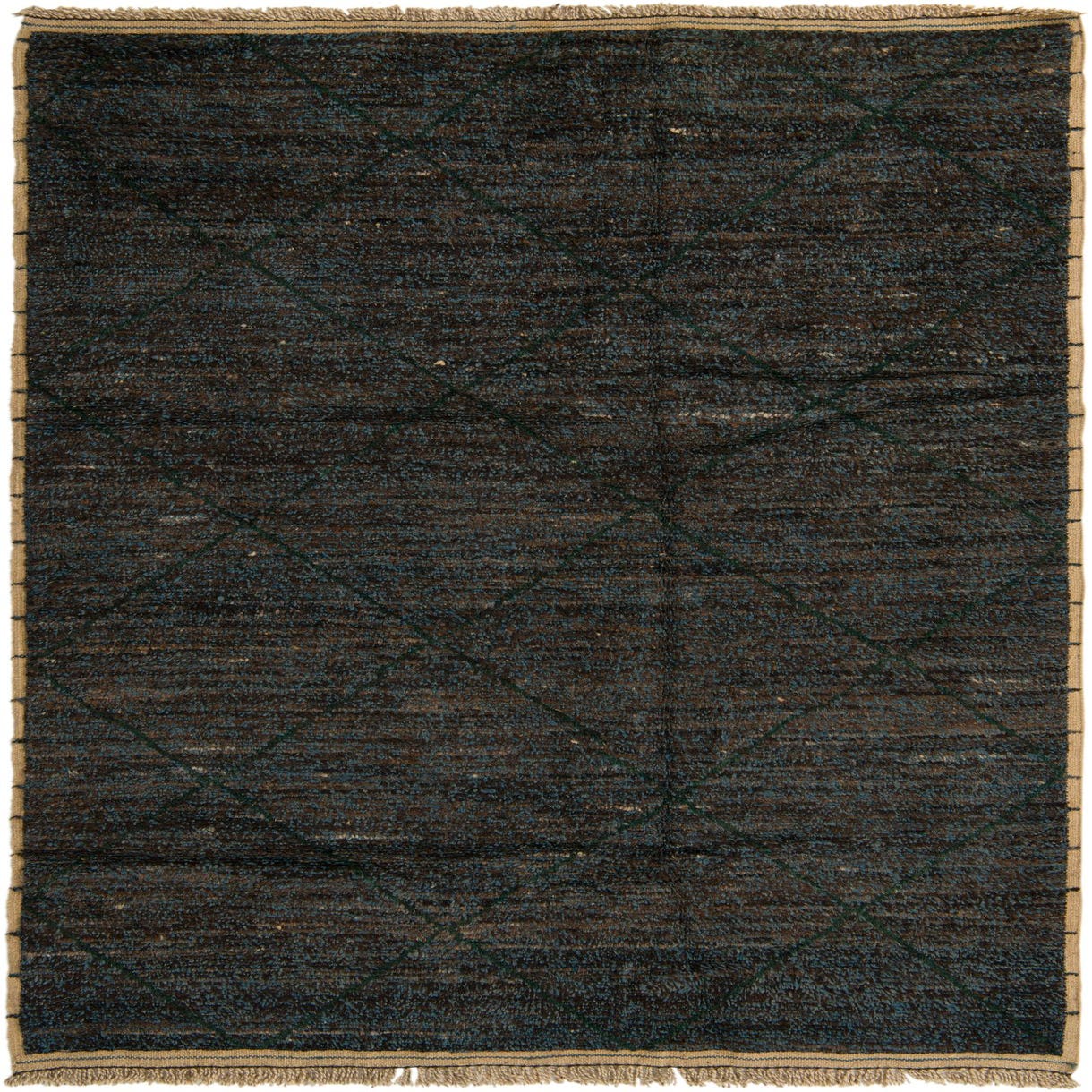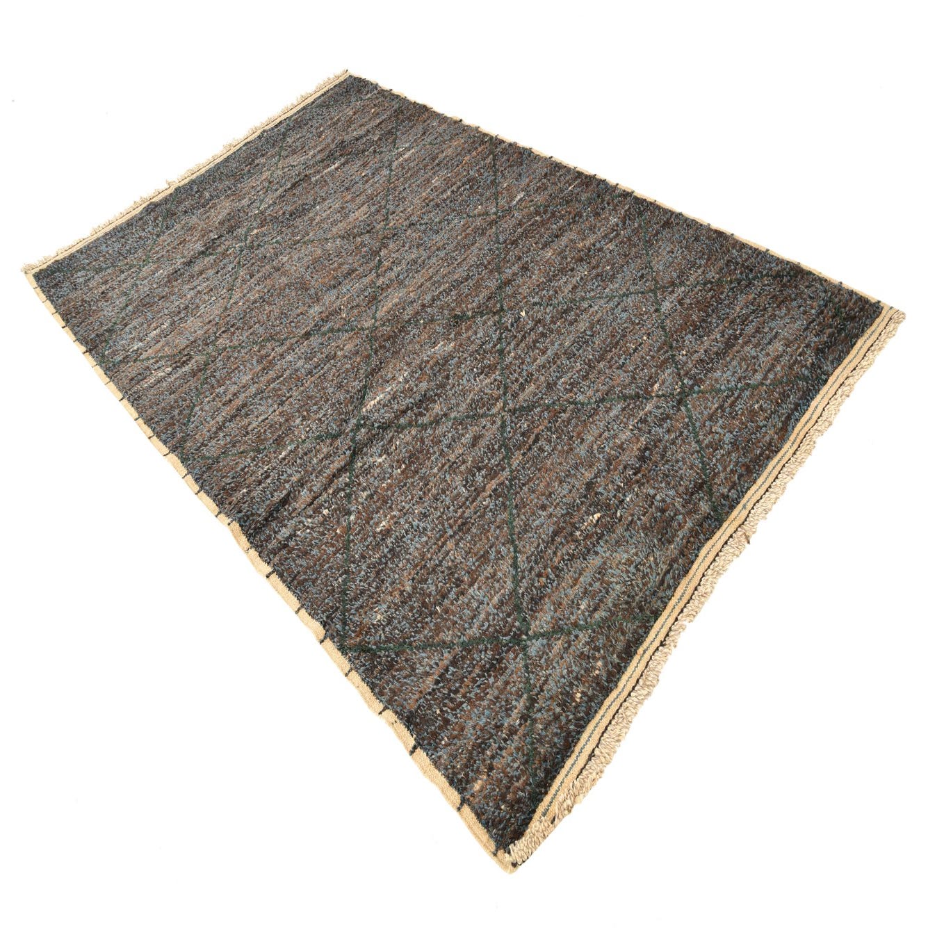 The Moroccan Collection offers a hand-knotted rug crafted from 100% wool, presenting a blend of durability and plush comfort. This 6x9 rug showcases a Brown Blue background with an overlaying pattern that harbors hues of Gray and Hunter Green. The design is characterized by a series of intersecting lines creating diamond shapes throughout the piece, which gives the rug a geometric yet understated motif. Each end is finished with a modest fringe detail, adding to the tactile experience and visual interest.