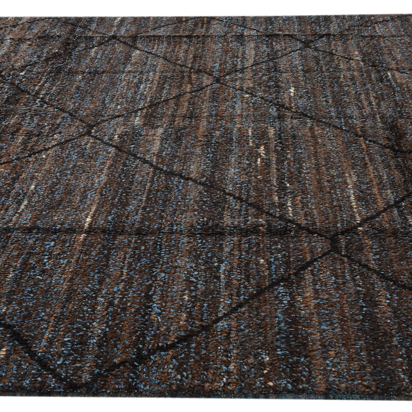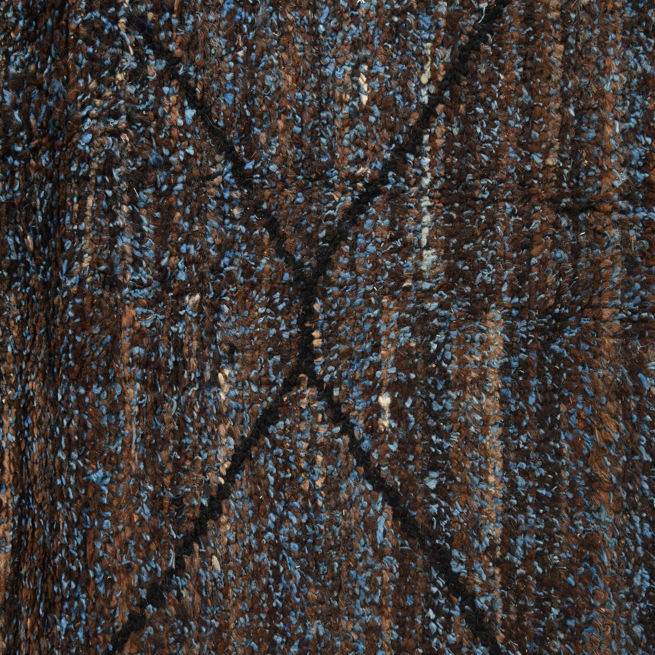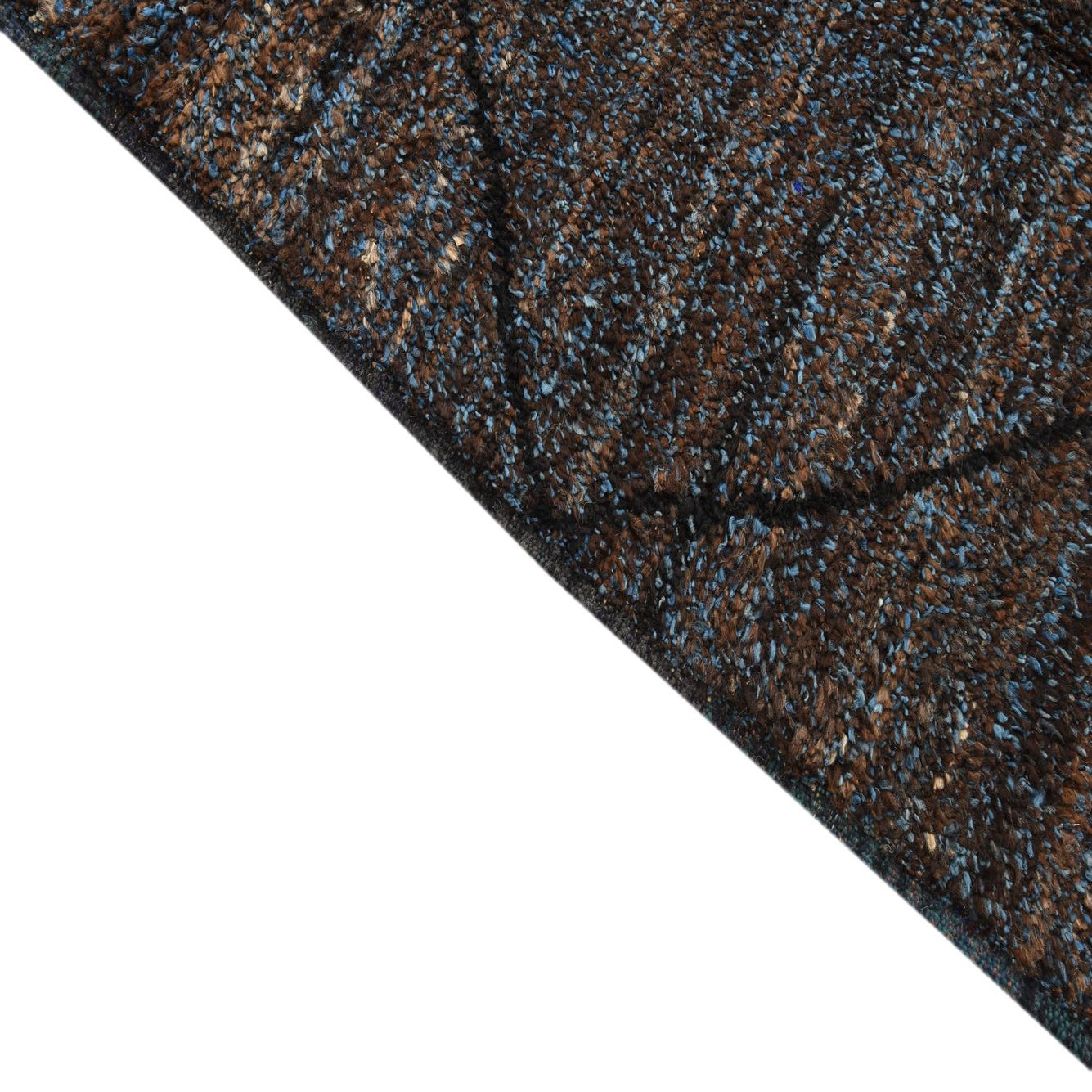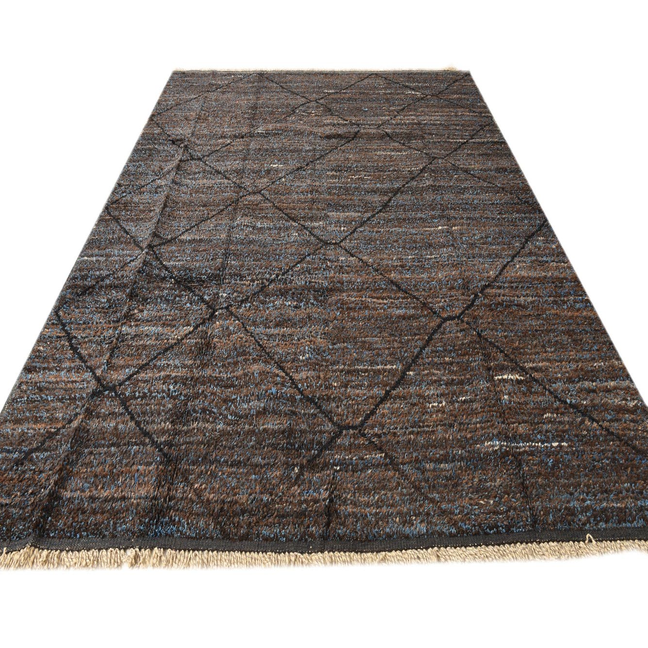 An 8x10 rectangular brown and blue shag rug with a dark tribal diamond pattern, ideal for a living room.