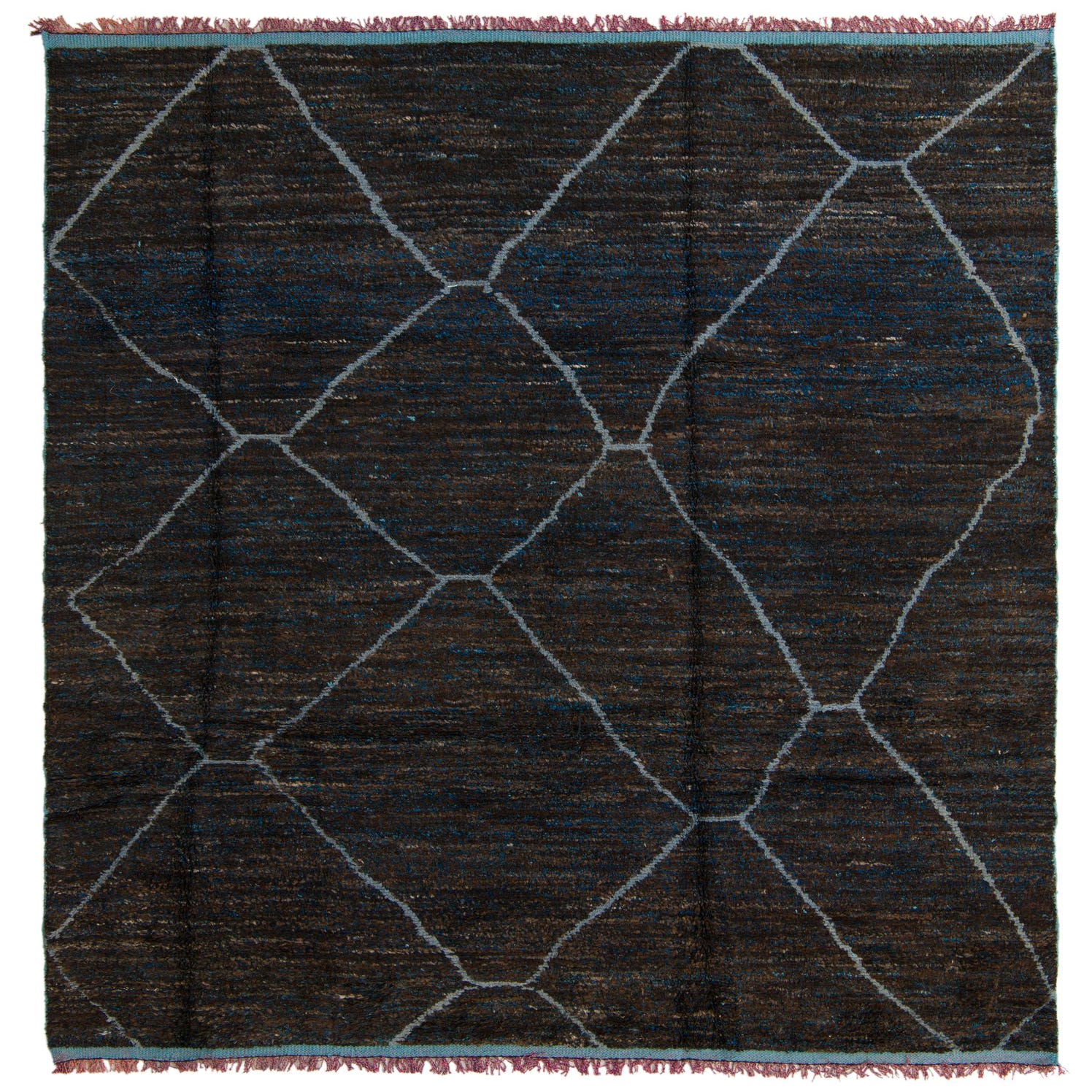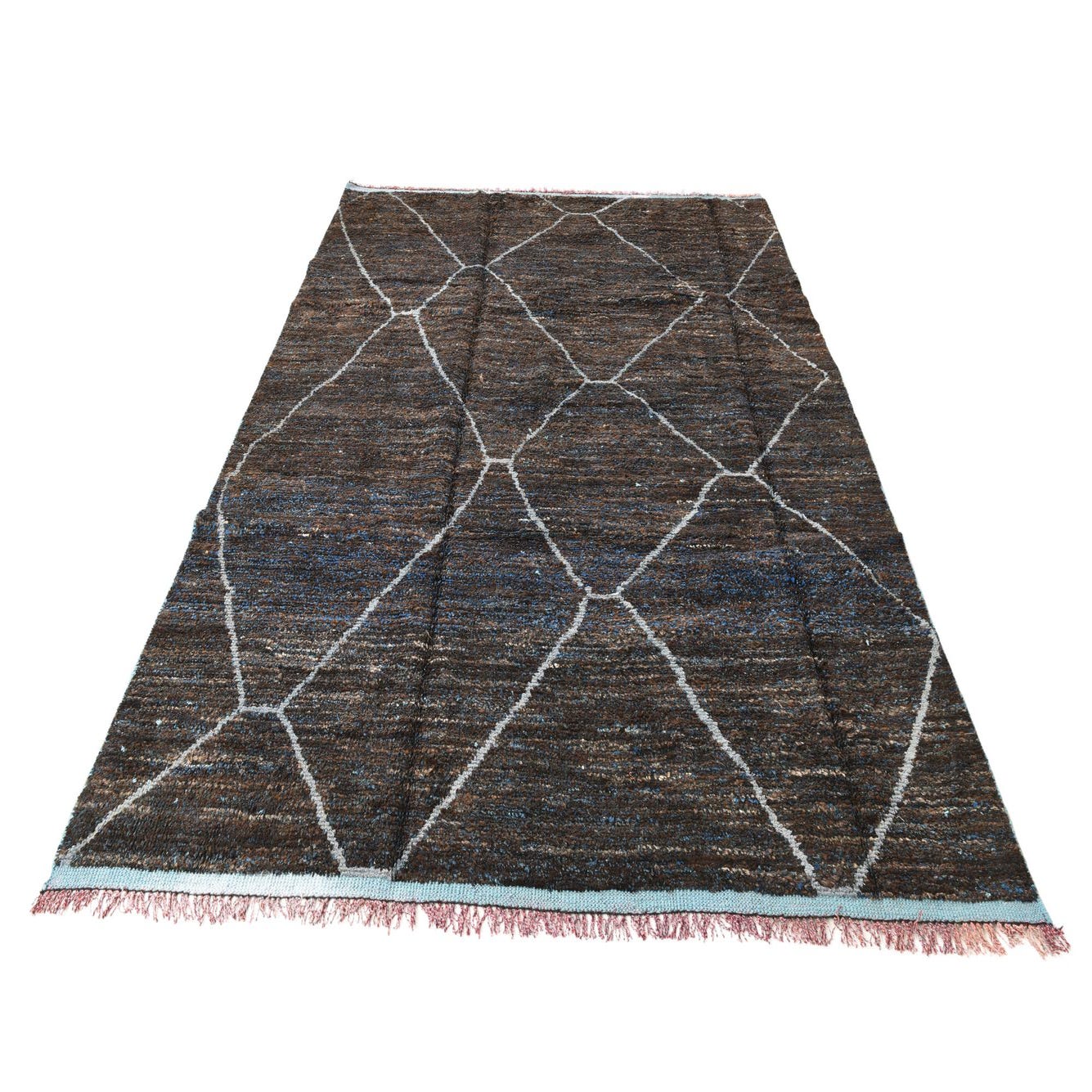 A rectangular 8x10 brown and blue shag rug with a modern tribal diamond pattern, ideal for a living room.