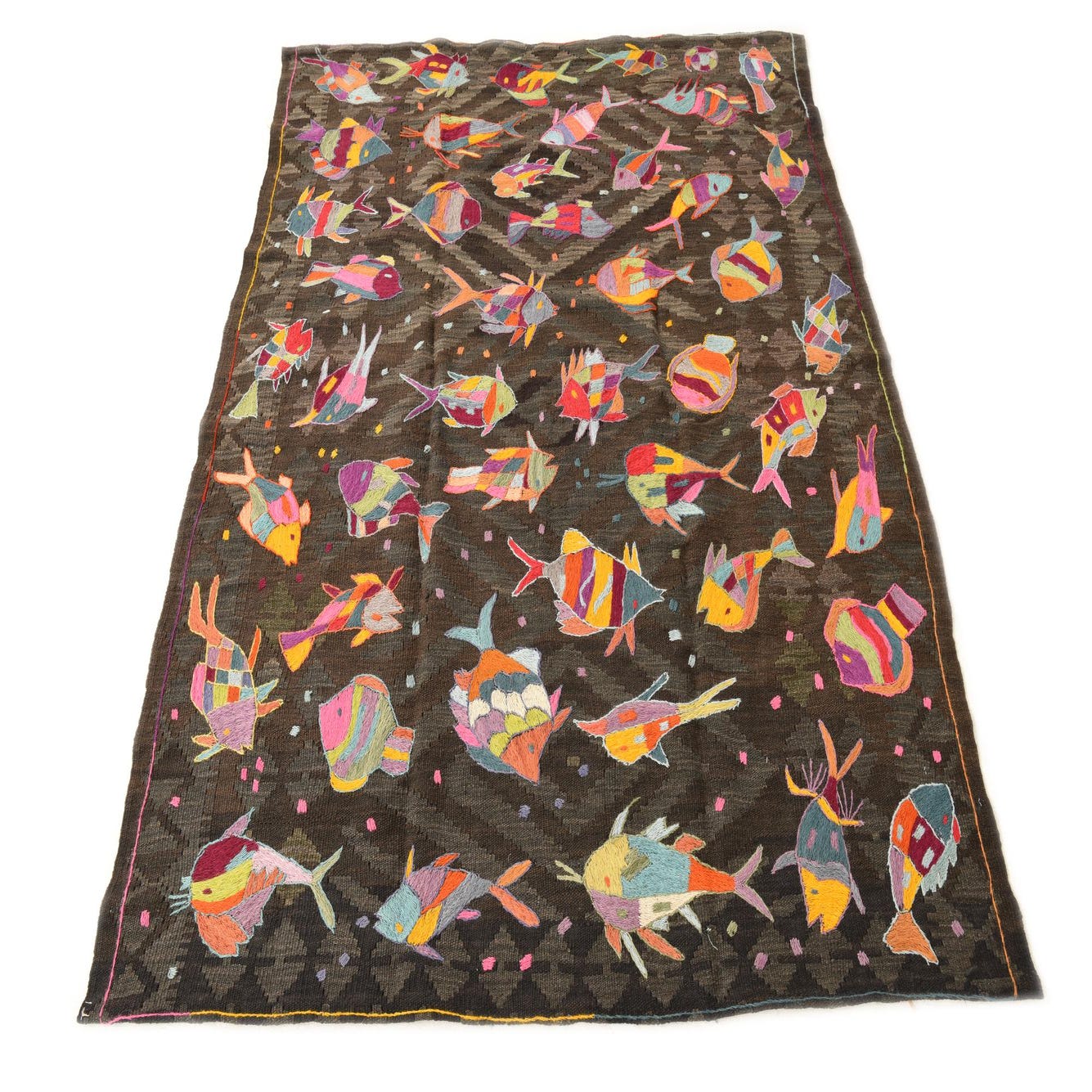 A 4x6 rectangular brown flatweave rug with a tribal pattern of colorful, embroidered fish and small dots.
