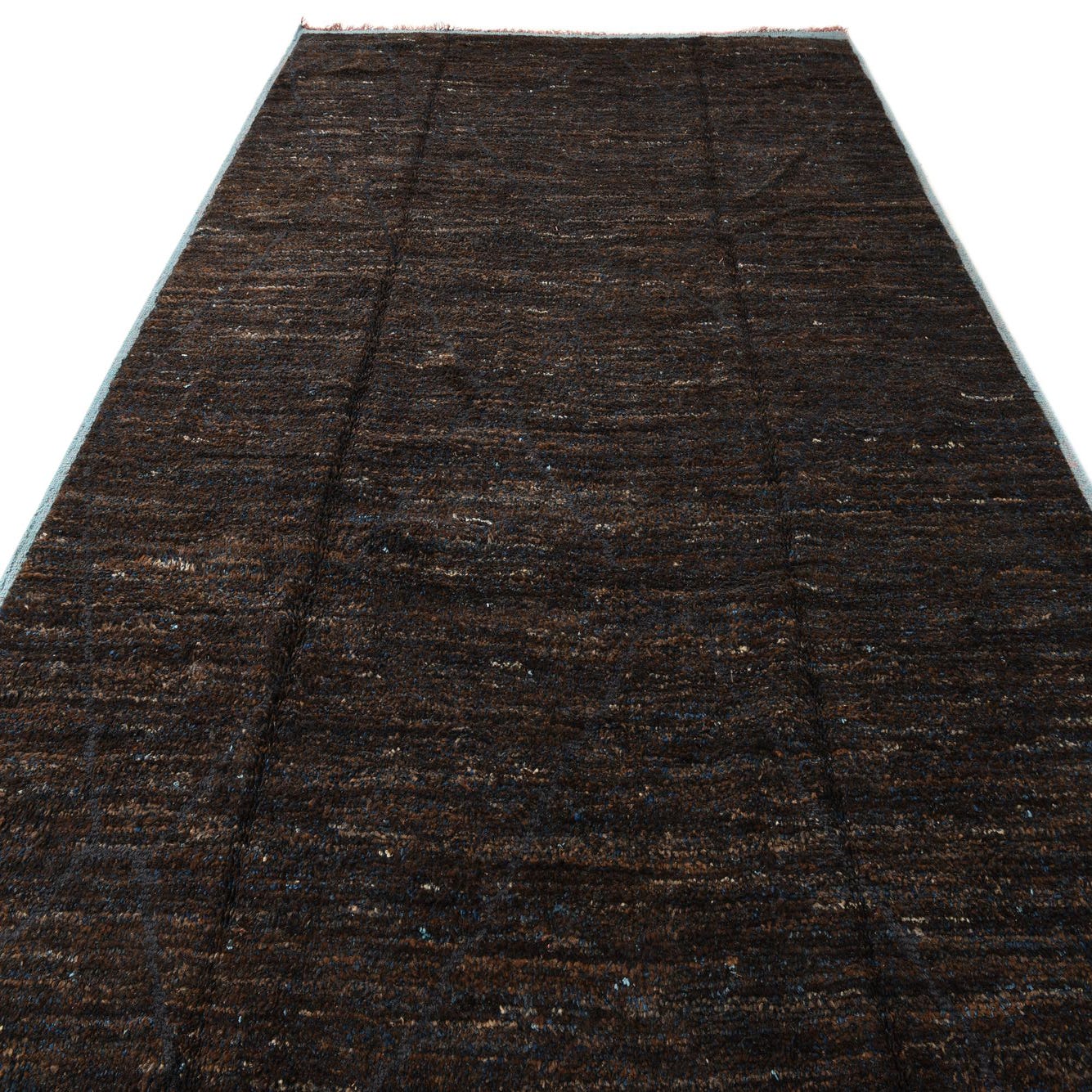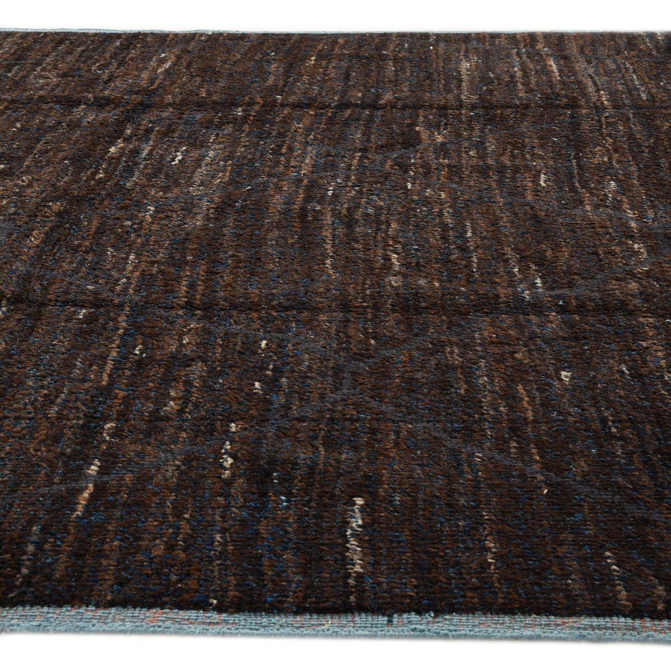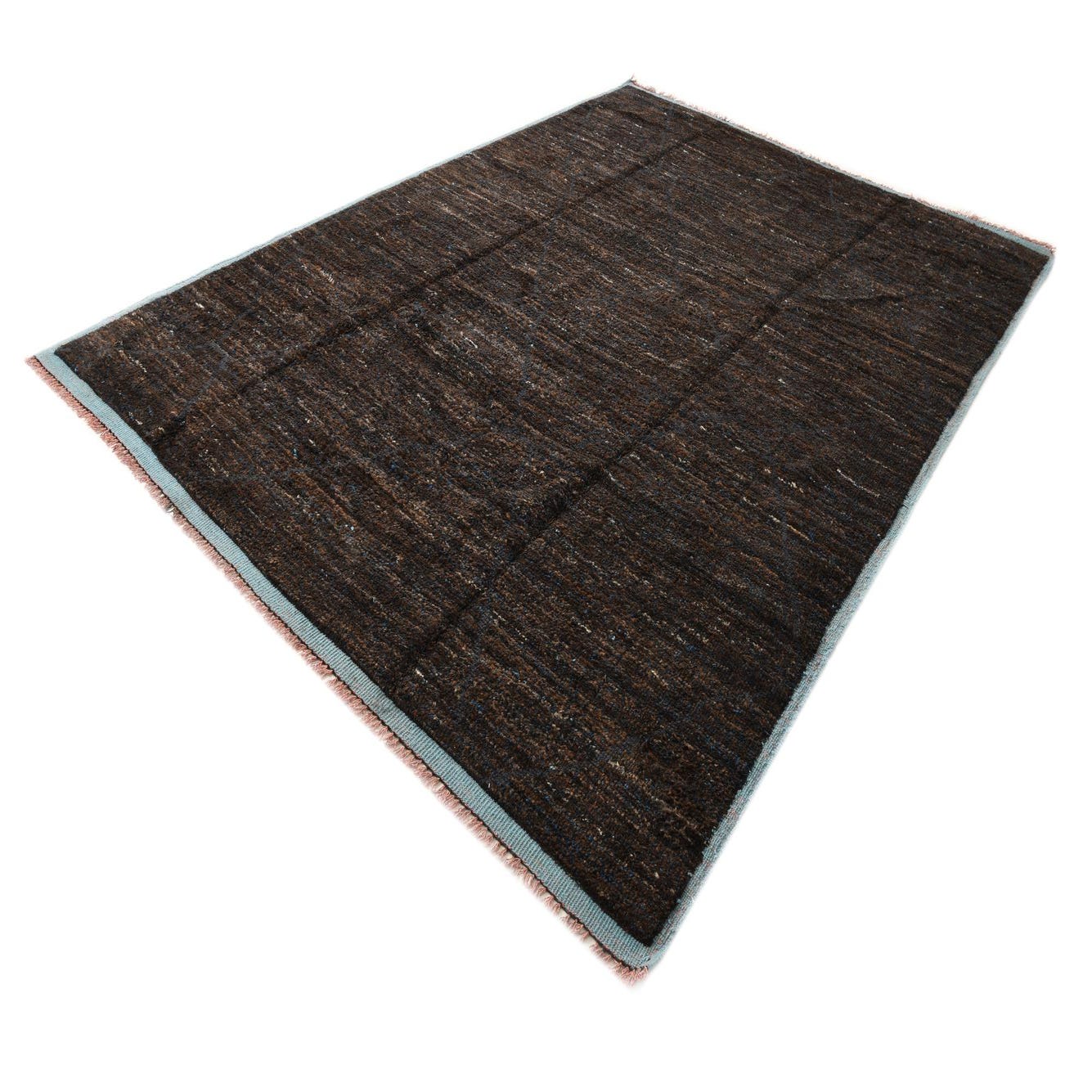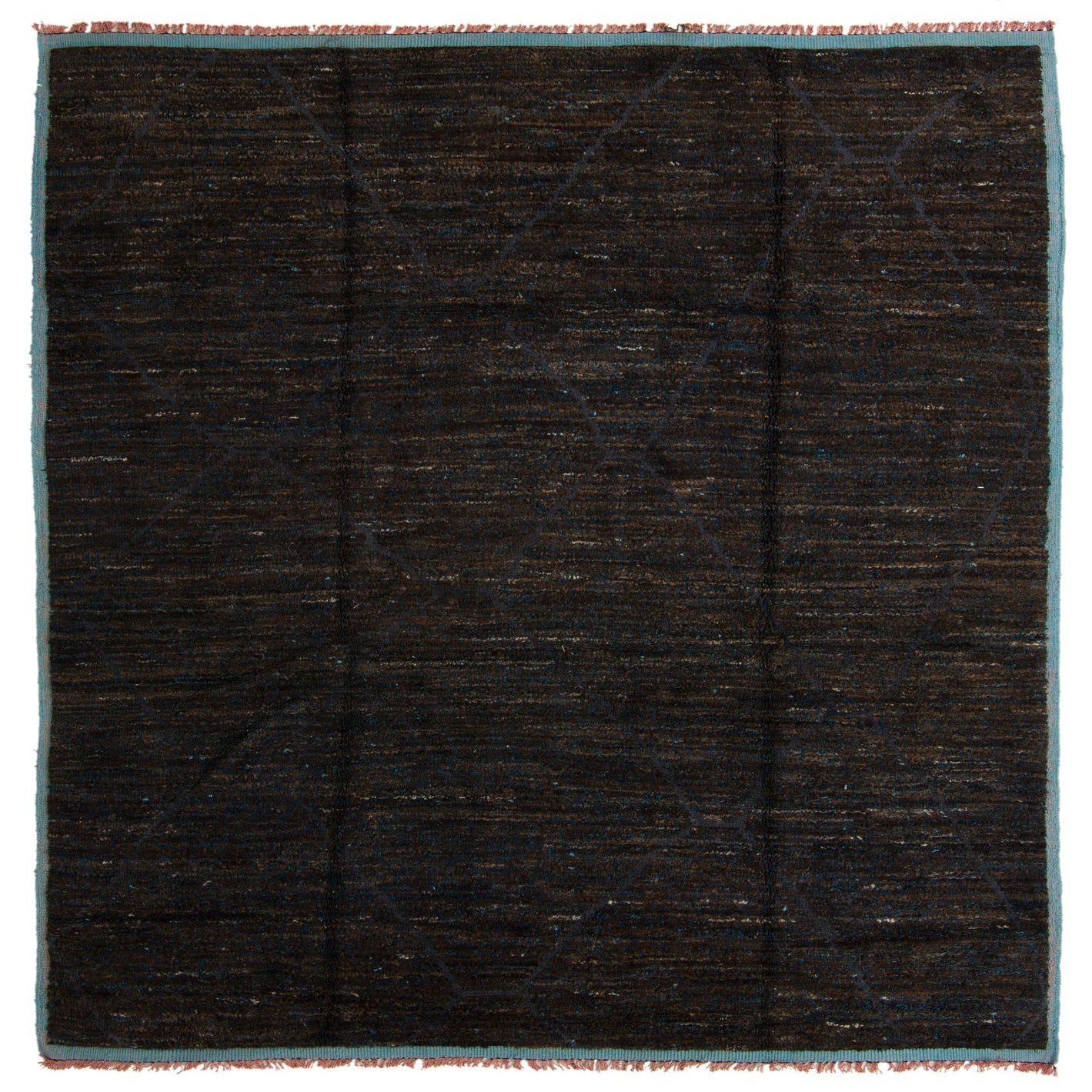 A 9x12 rectangular brown shag rug with subtle tribal patterns and a light blue border, handmade from wool.