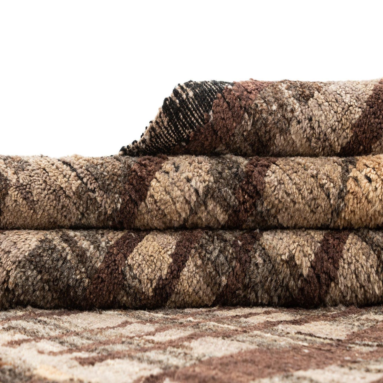 Rectangular Beni Marok wool rug with abstract Persian pattern in varying shades of brown and tan.
