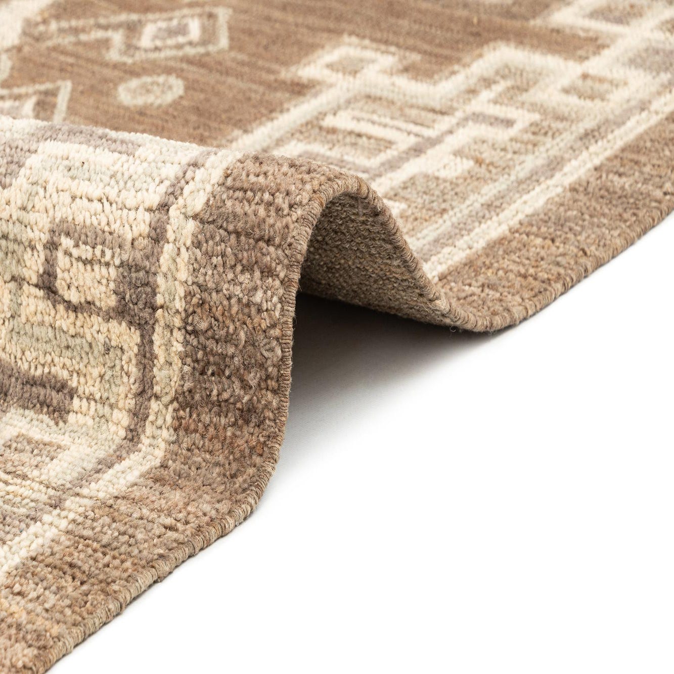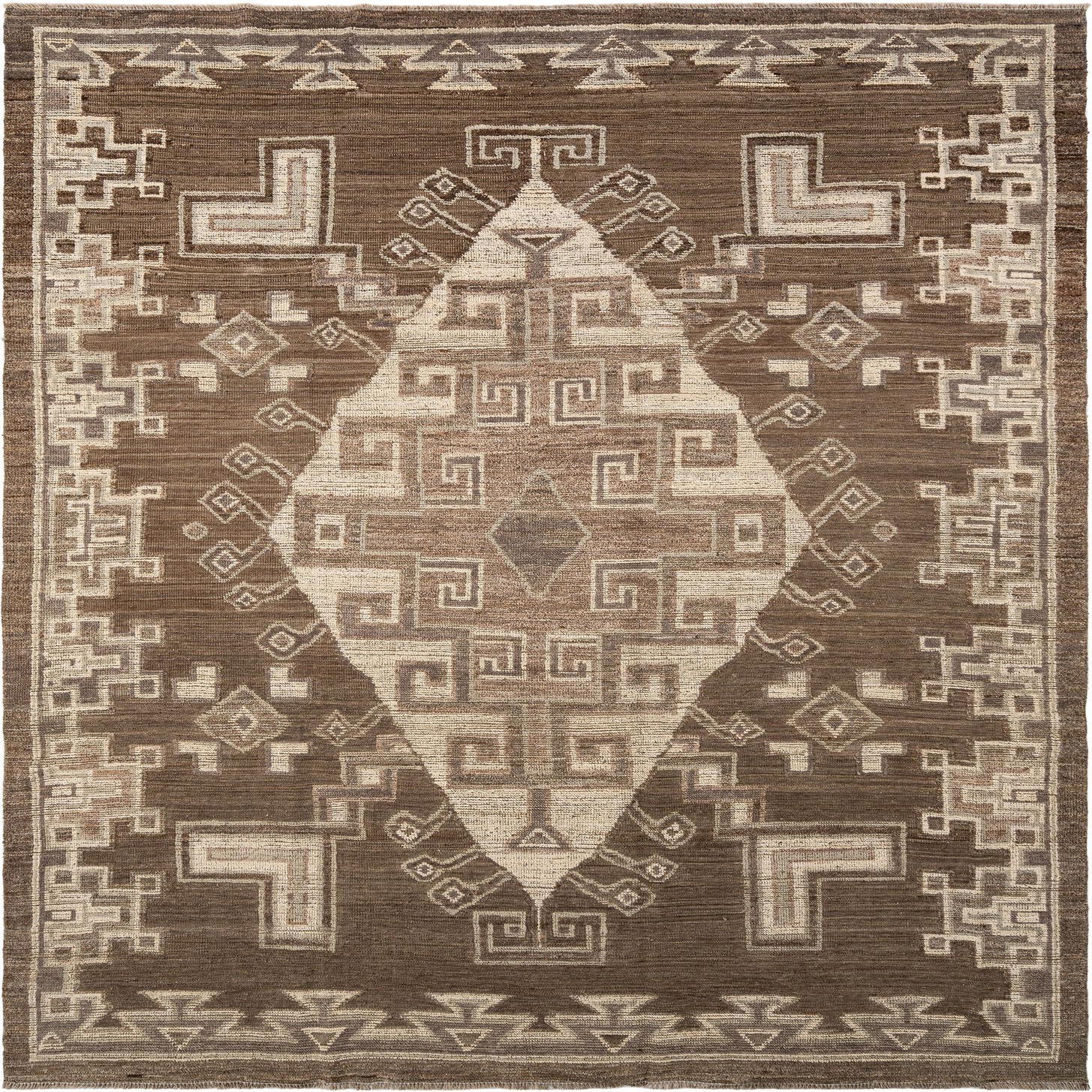 A rectangular wool rug featuring a central diamond motif and geometric patterns in shades of brown and tan.
