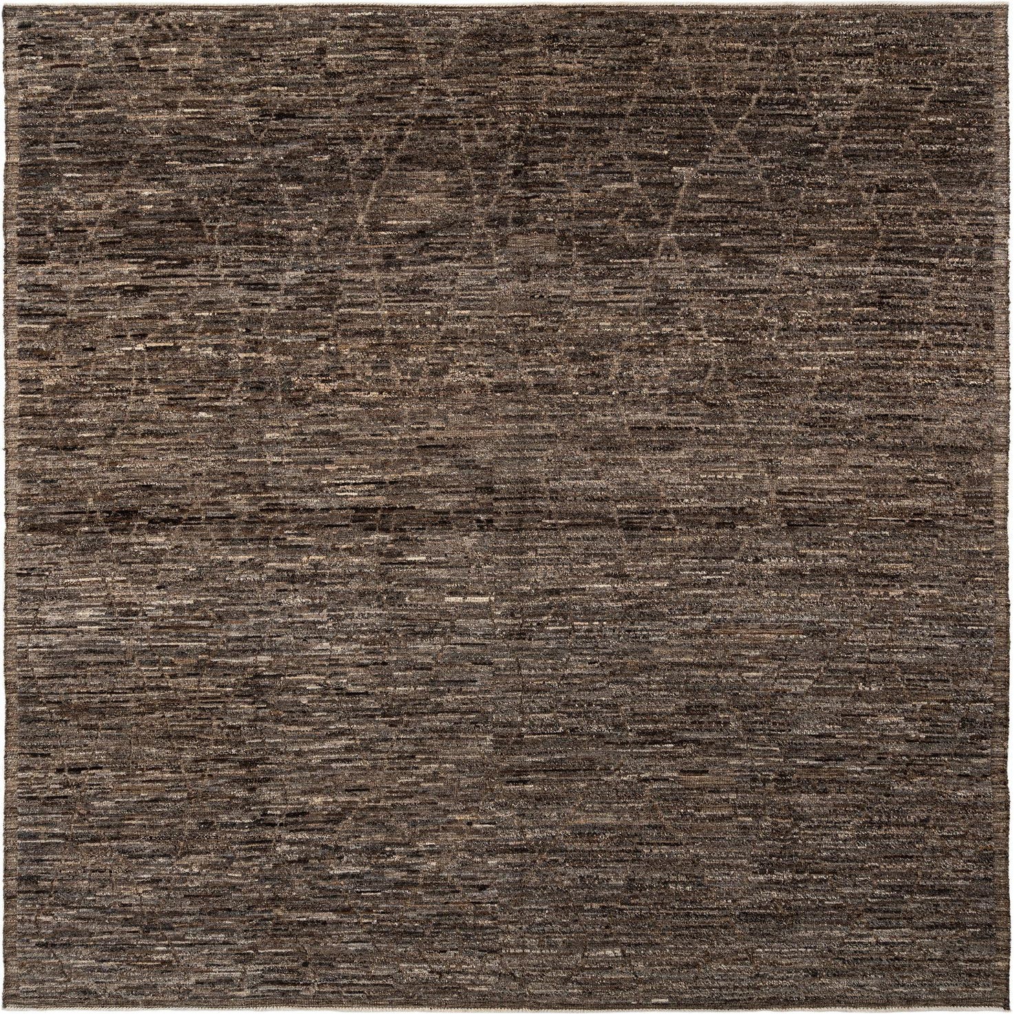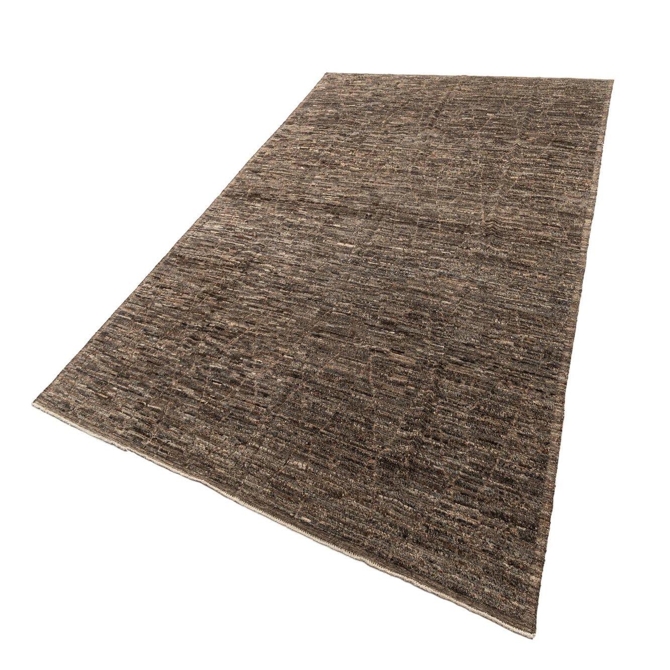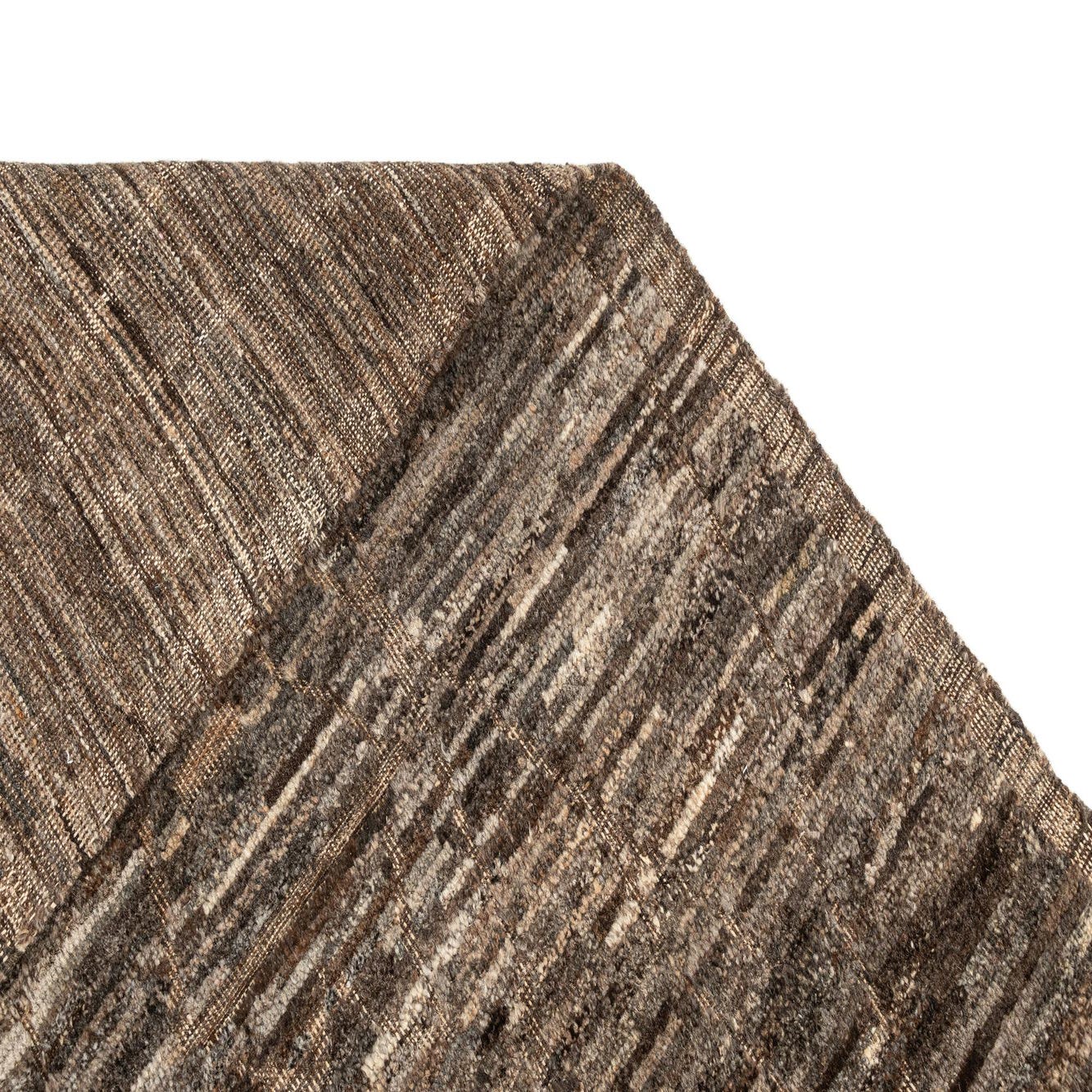 A handmade rectangular Beni Marok wool rug in varying shades of brown and tan, featuring a subtle Persian pattern.