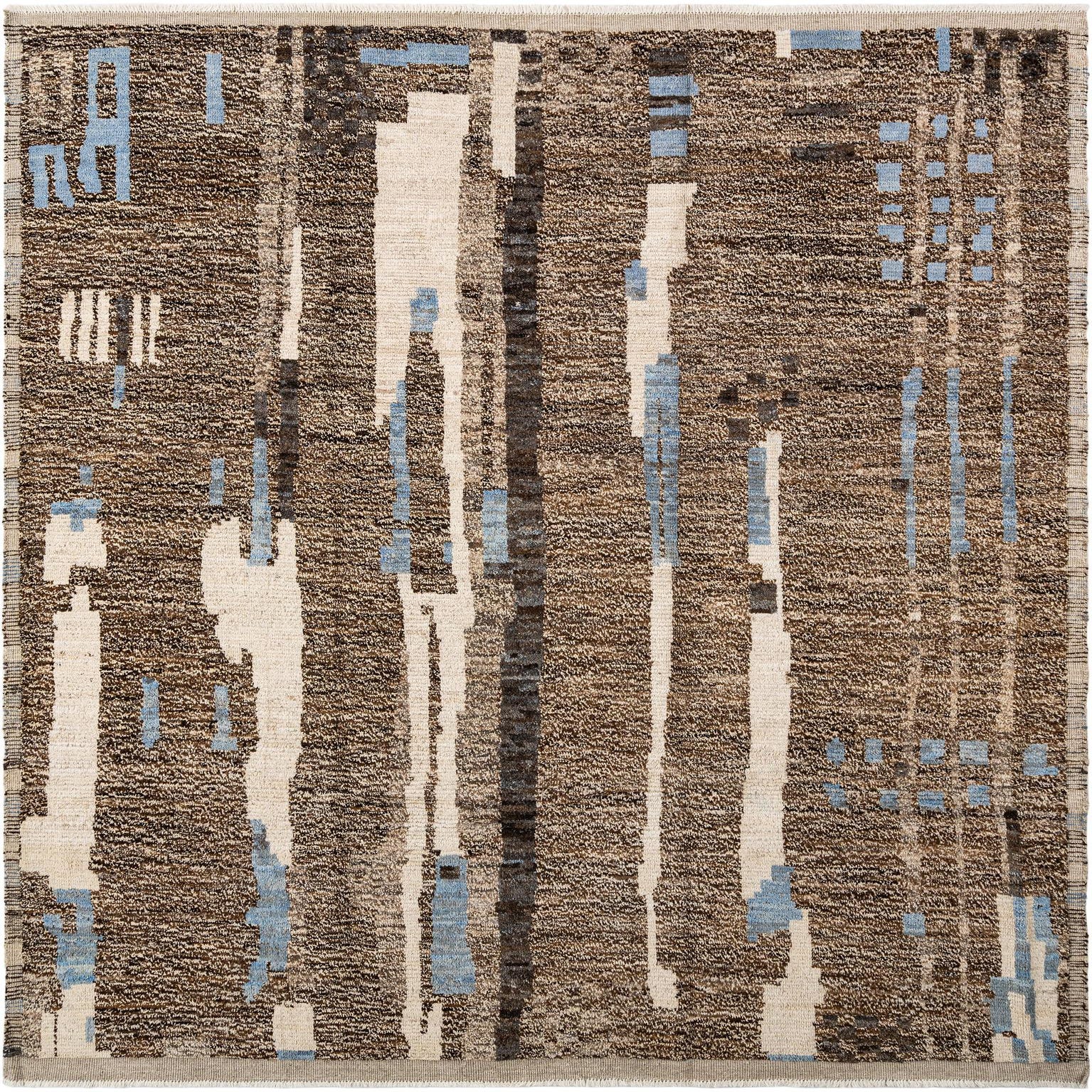 A rectangular Beni Marok rug with a textured Persian pattern in shades of brown, tan, and light blue.