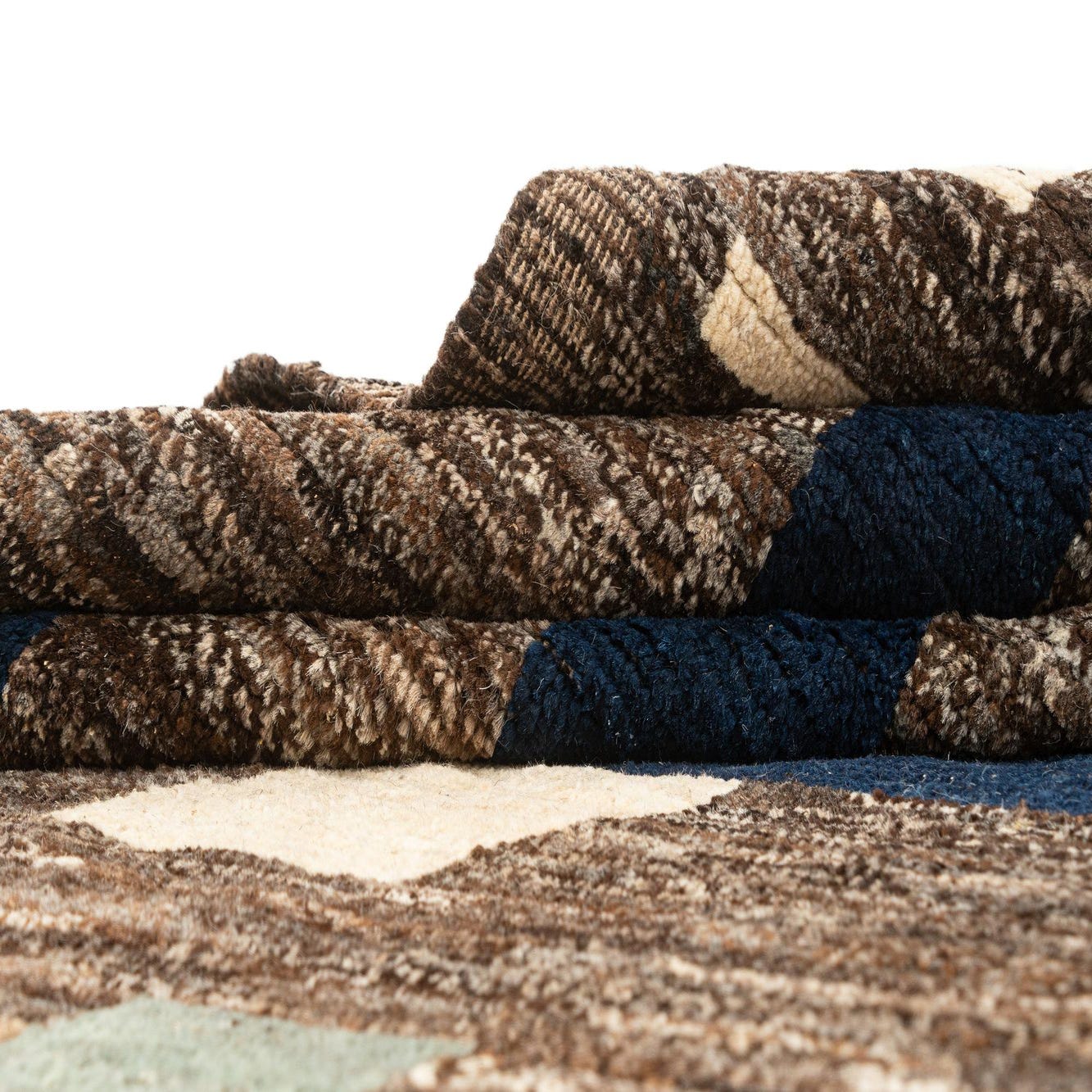A rectangular Beni Marok Persian rug featuring a textured brown background with abstract navy blue, light blue, and cream geometric shapes.