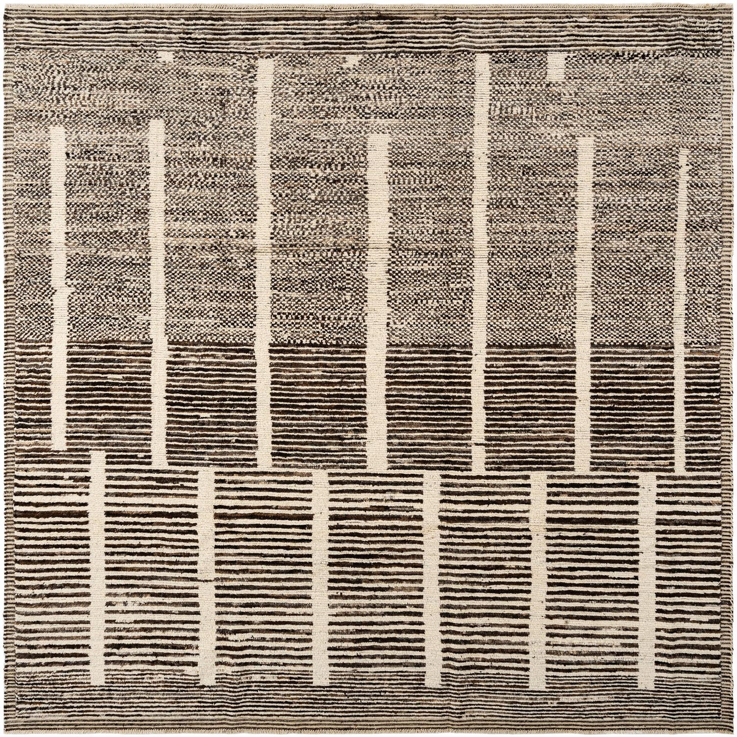 A warm brown field anchors a clean, linear composition of vertical cream bands and stacked horizontal stripes. The design alternates a densely textured, peppered weave with more regular, narrow lines, creating a subtle grid that reads both modern and handcrafted. Thin striped borders frame the piece, giving it a balanced, architectural presence that works with a variety of furniture layouts.