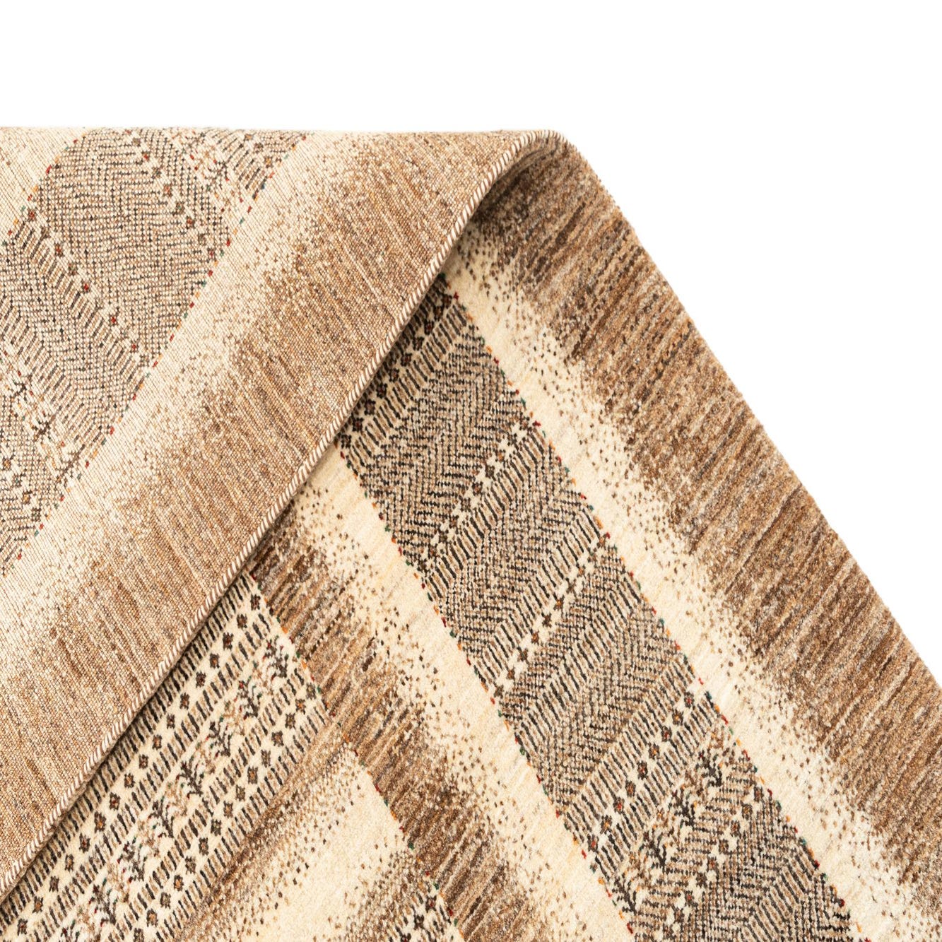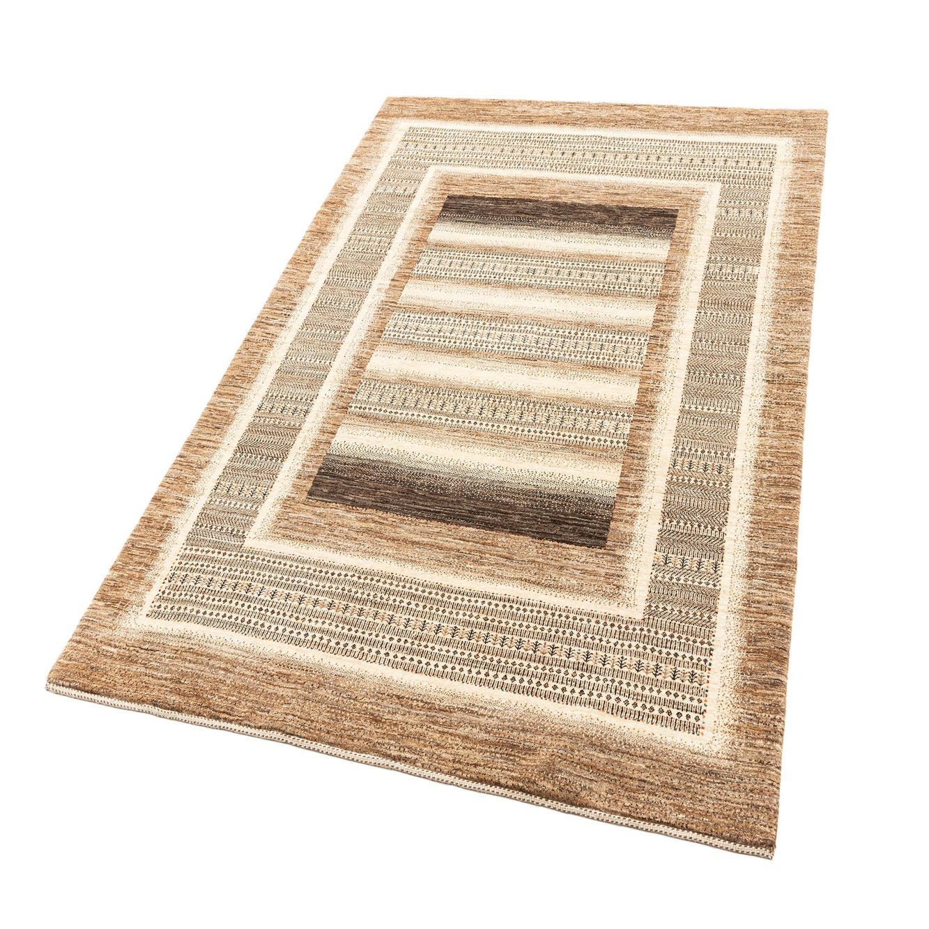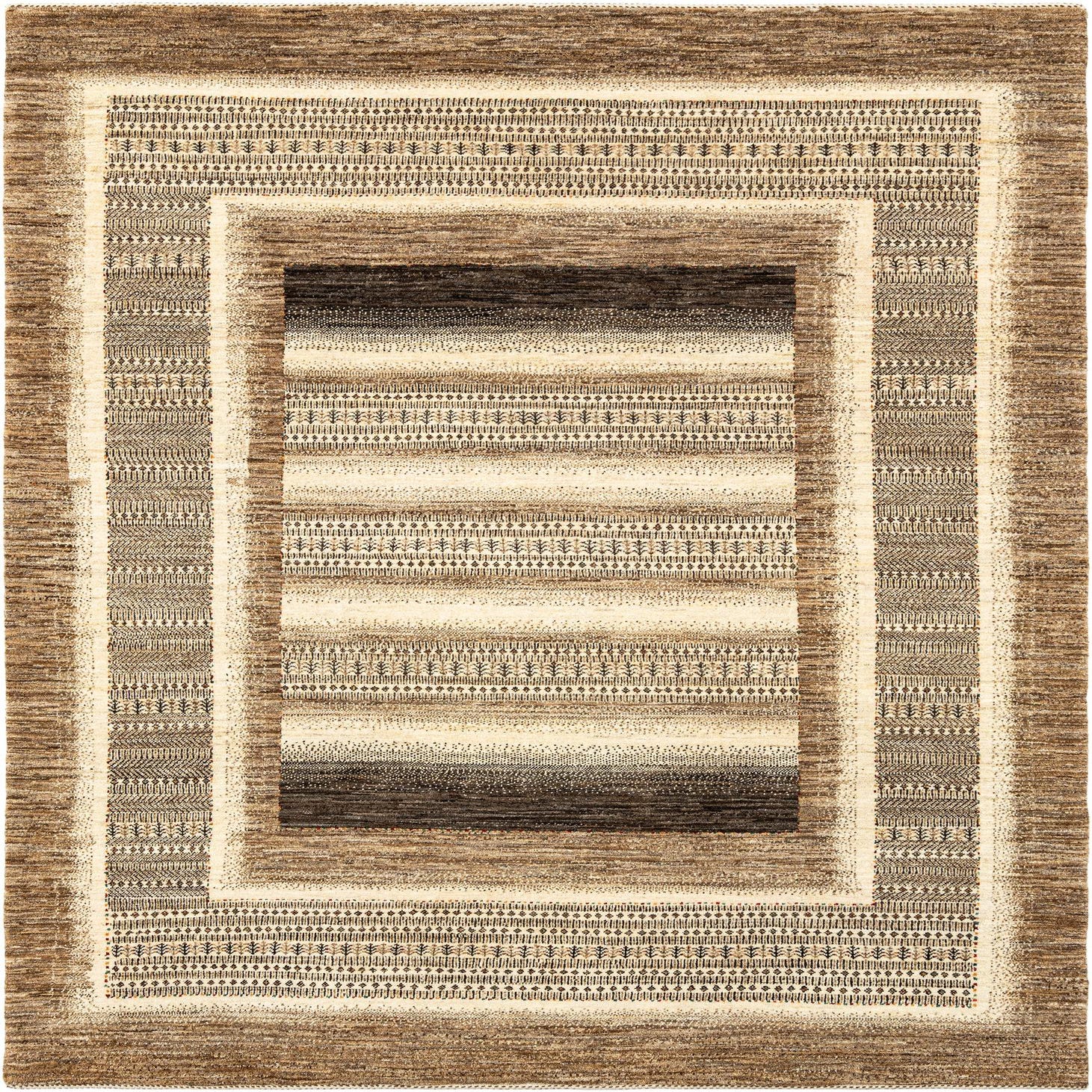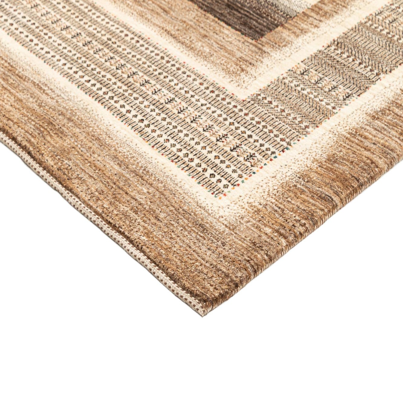 A rectangular Kashkuli Persian wool rug featuring concentric borders in shades of brown and tan with intricate patterns.