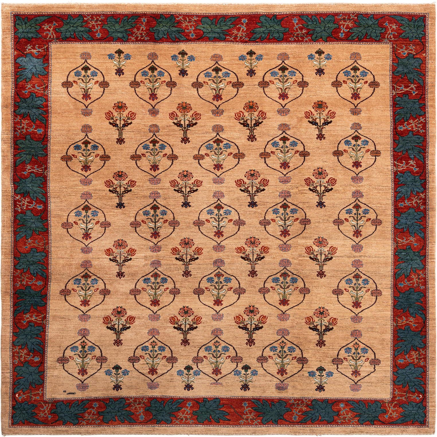 A rectangular, handmade Luribaft Persian rug featuring a tan field with repeating floral motifs in blue, red, and orange, framed by a red border with large teal leaves.