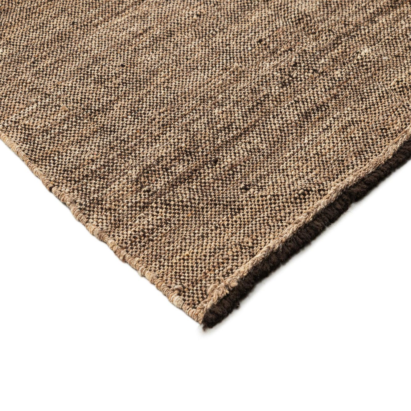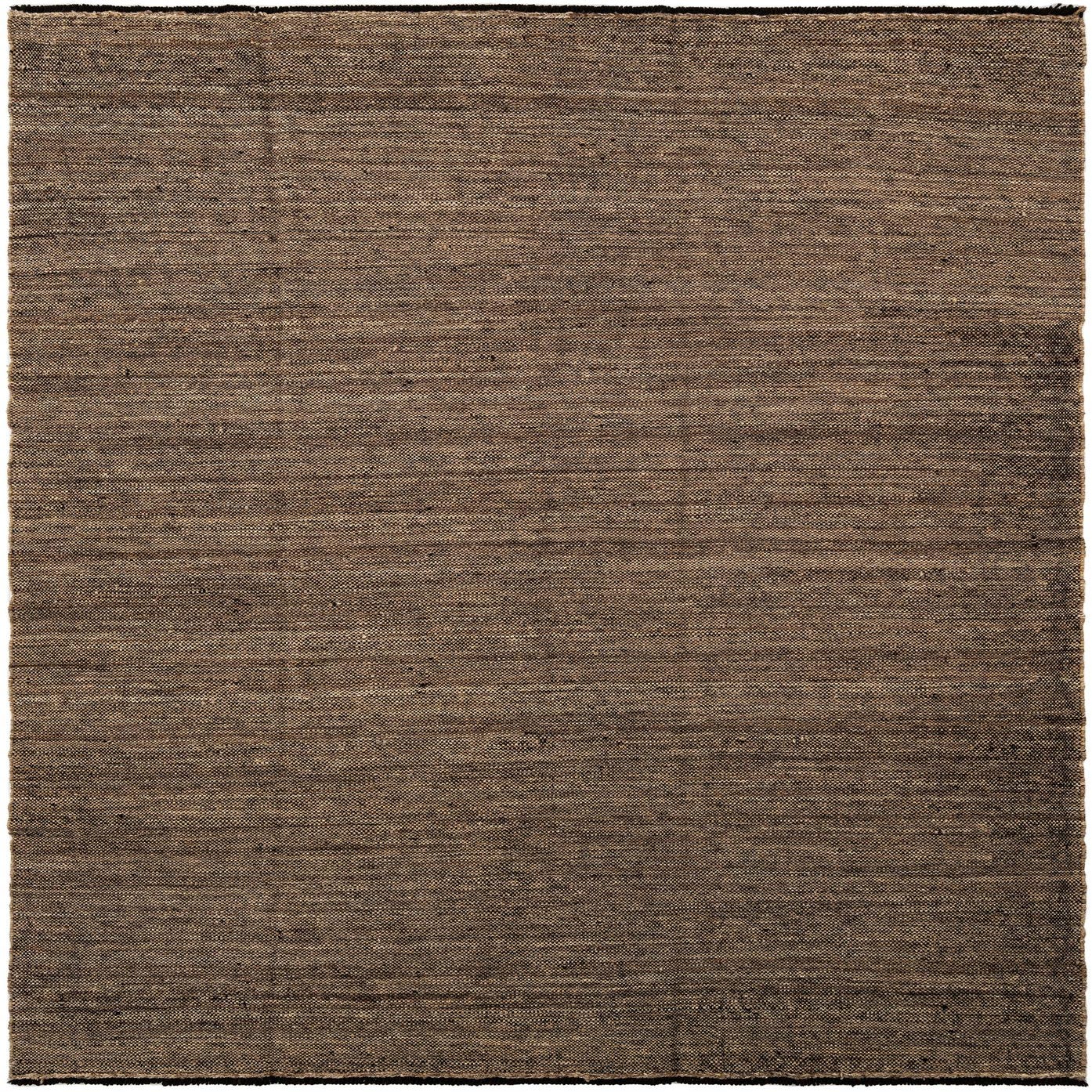A rectangular handmade brown wool flatweave rug with subtle tan variations, showcasing a rustic, natural texture.