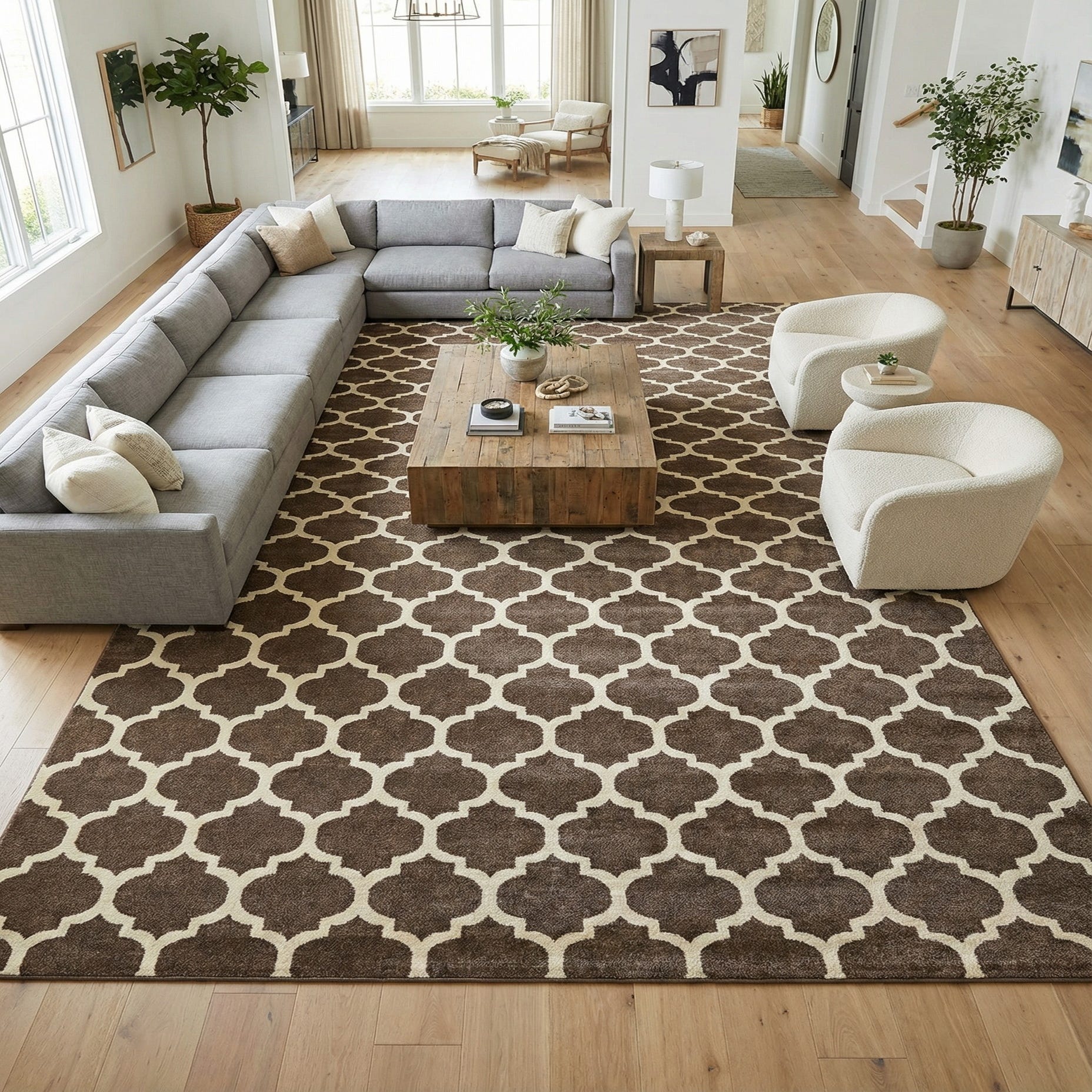 This piece pairs naturally with warm wood tones, leather sofas, and neutral upholstery, bringing structured pattern to transitional, contemporary, or farmhouse interiors. Use it to anchor a living room seating area, define a dining space, or add interest to an entryway or home office. The brown background and beige motif make it easy to layer with textured throws, woven baskets, and metal or wood accents for a lived-in, pulled-together look.