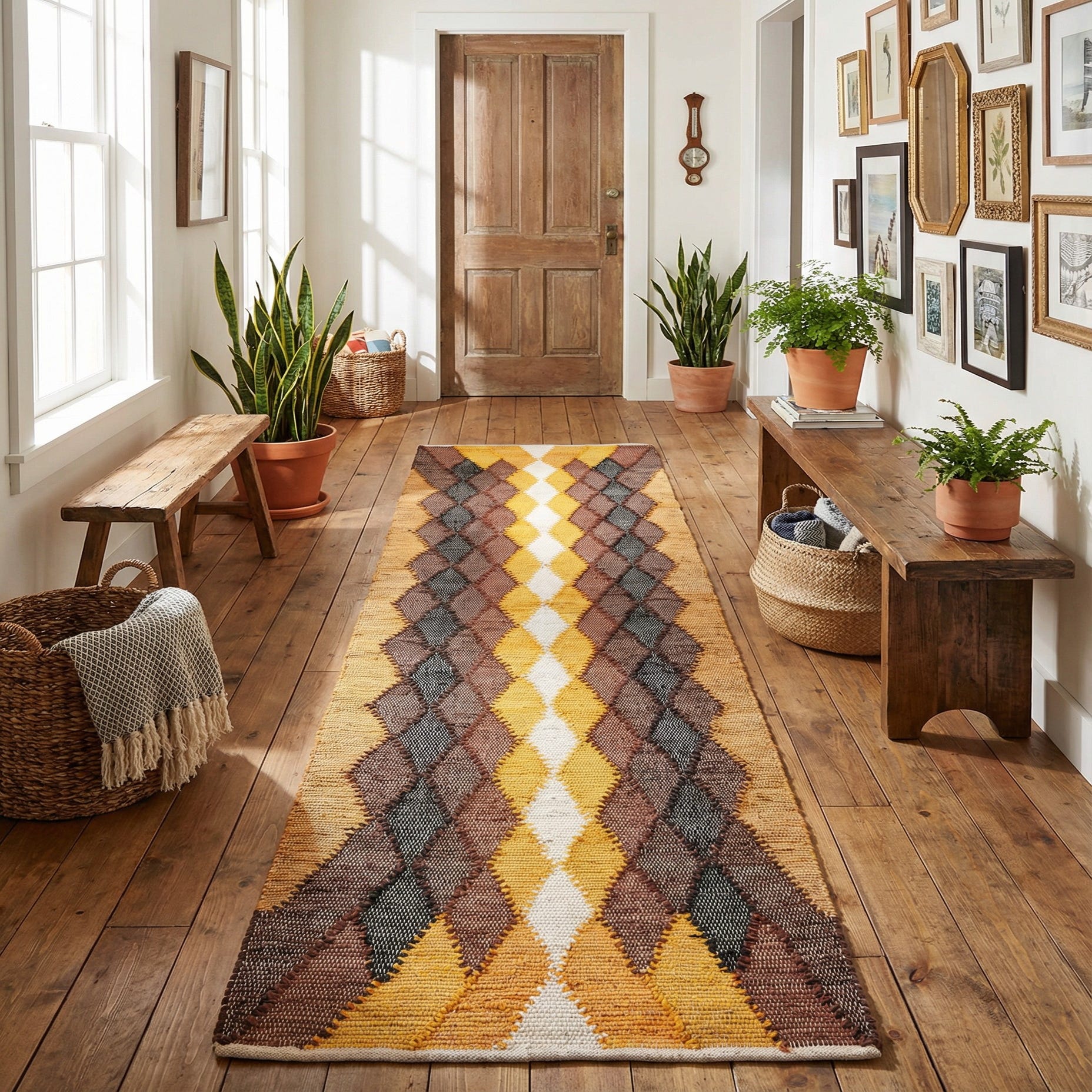 Ideal for narrow spaces, this runner works well in hallways, entryways, kitchens, or alongside a bed. Pair it with warm wood floors, leather or upholstered seating, and matte black metal accents for a cohesive look. Its color palette and pattern suit mid-century modern, rustic farmhouse, bohemian, and southwestern-inspired interiors, adding a structured graphic element without overpowering the room.