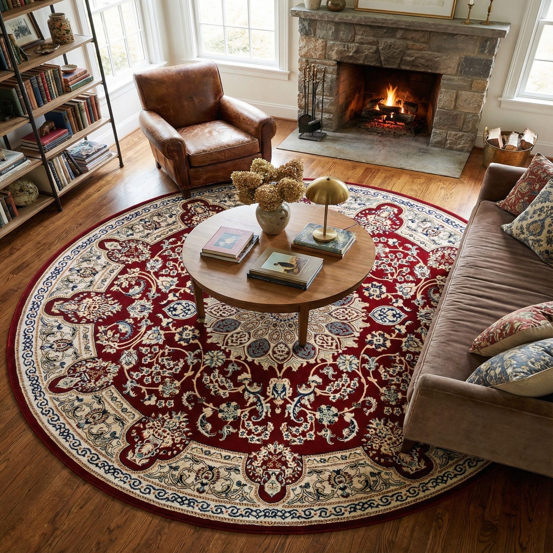 A classic Persian-inspired medallion sits at the center of this round rug, carved in cream and ivory with blue and beige petal motifs that radiate outward across a rich burgundy field. Delicate floral vines, small rosettes and teardrop motifs weave through the background in shades of navy blue, puce, green and beige, while an ornate cream border with scrolling navy accents frames the whole composition. The overall effect is formal and balanced, with clear, finely rendered motifs that hold their shape across the circular format.