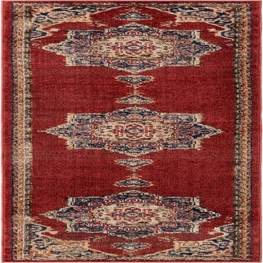 A 10 ft red runner rug with a distressed traditional medallion pattern in navy, cream, and gold, perfect for a hallway.