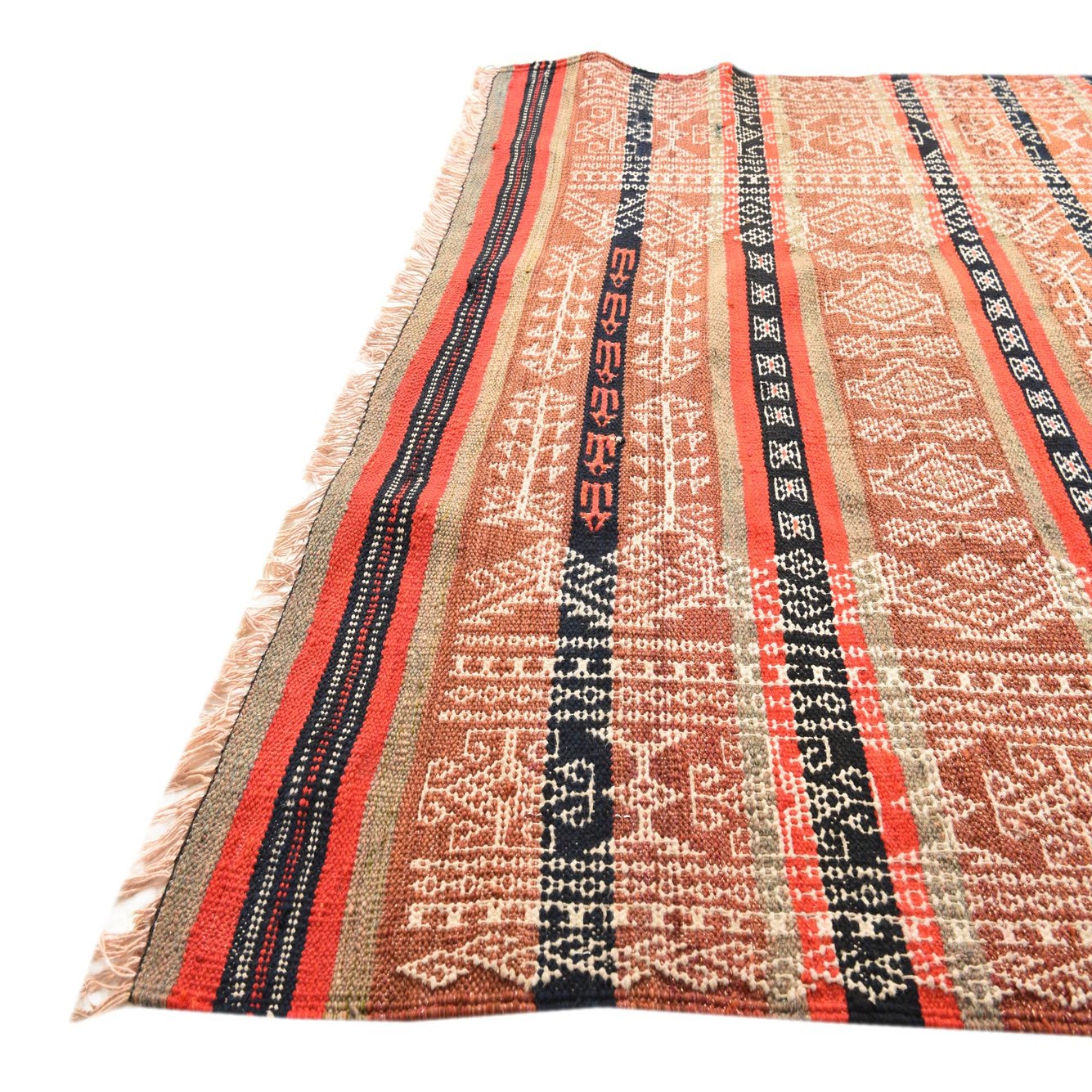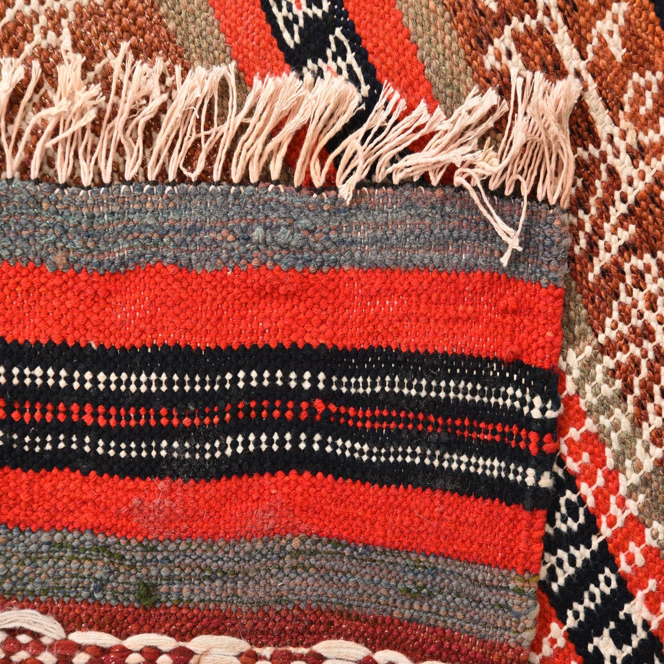 With its flatweave construction, the rug provides a smooth, low pile that complements its robust design and lends itself to high-traffic areas. The presence of fringe on either end accentuates the textile's authenticity and heritage, while the semi-antique age of 40-60 years speaks to its enduring quality and aesthetic.