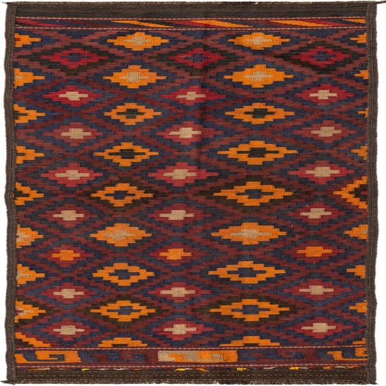 The Kilim Fars collection presents a 10 Ft Runner hand-woven from 100% wool, offering a robust and tactile surface. This semi-antique rug, aged between 40 to 60 years, brings both historical value and traditional craftsmanship into your living space. The rug displays a dynamic geometric pattern, accentuated by a rich burgundy background, complemented by beige, brown, navy blue, and orange accents. These colors are harmoniously arranged in a repeating diamond motif, lending a sense of rhythm and structure to the design.