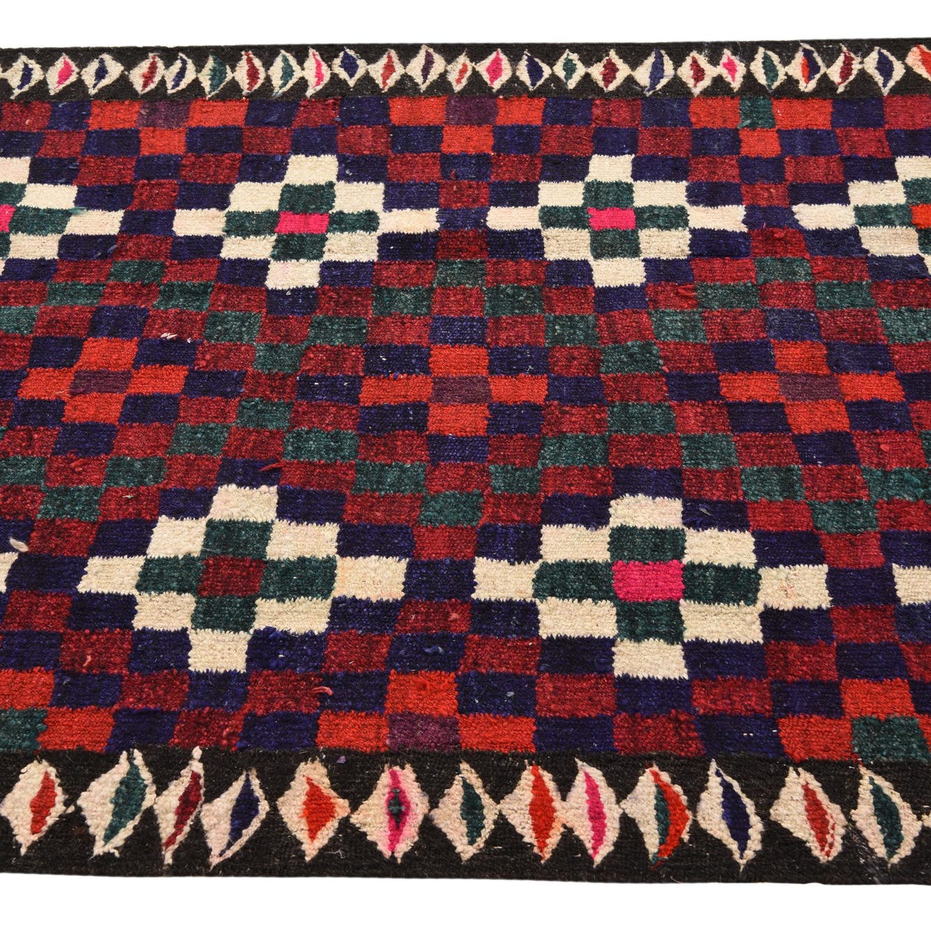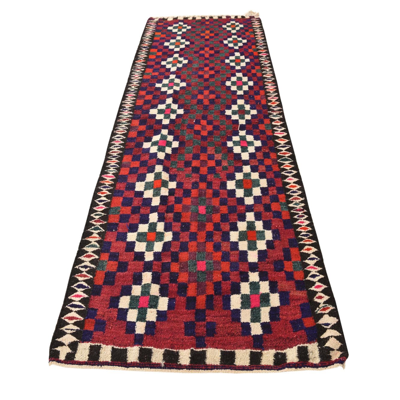 The Kilim Fars Collection presents a handwoven 10 Ft Runner that is a testament to the craftsmanship of traditional rug making. Crafted from 100% wool, this rug showcases a geometric, tessellated pattern characterized by a vibrant array of colors including burgundy, ivory, navy blue, pink, and black on a rich burgundy background. The interplay of these colors creates a dynamic and inviting visual tapestry that is well-suited to a variety of interiors.