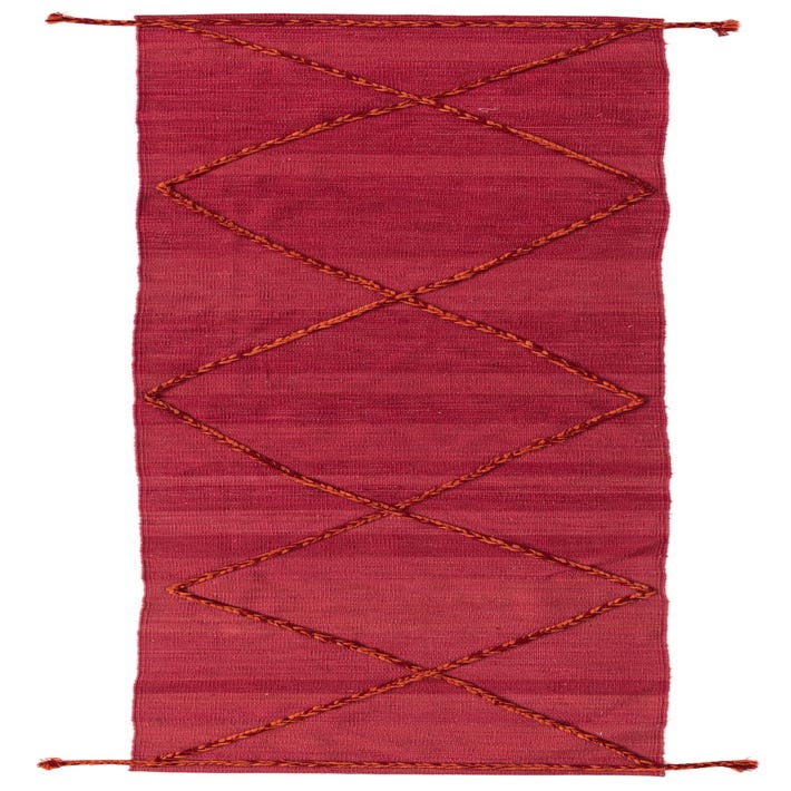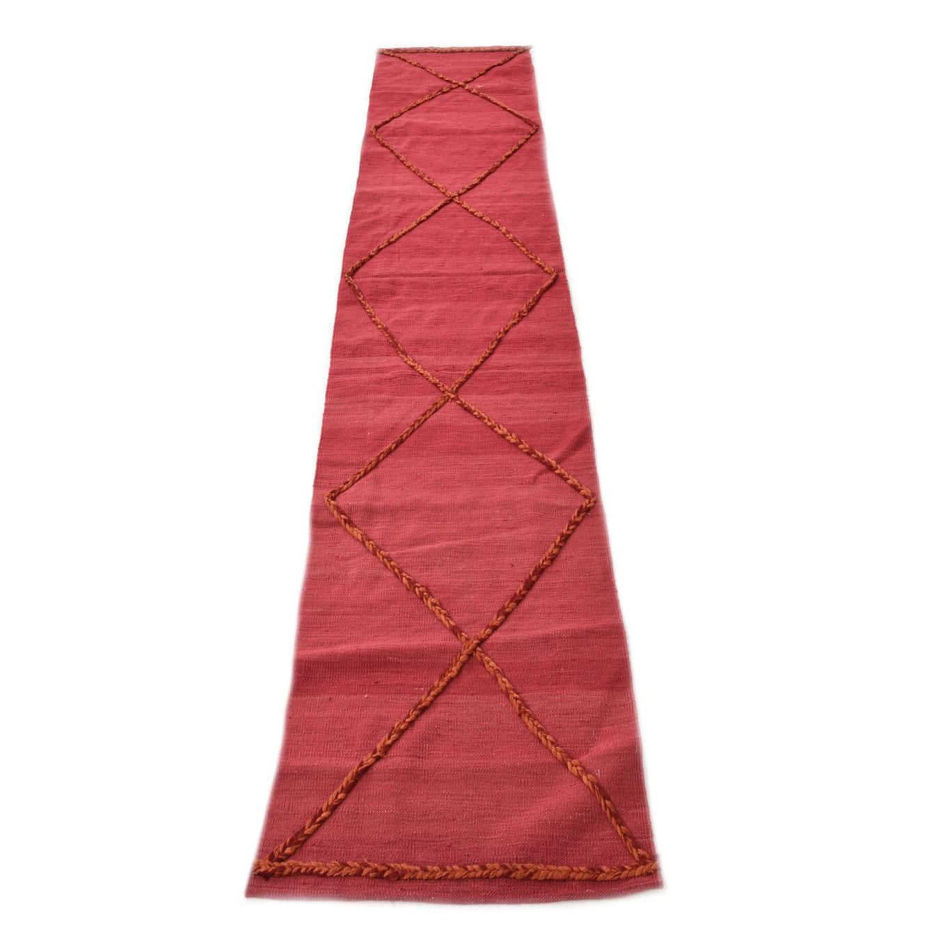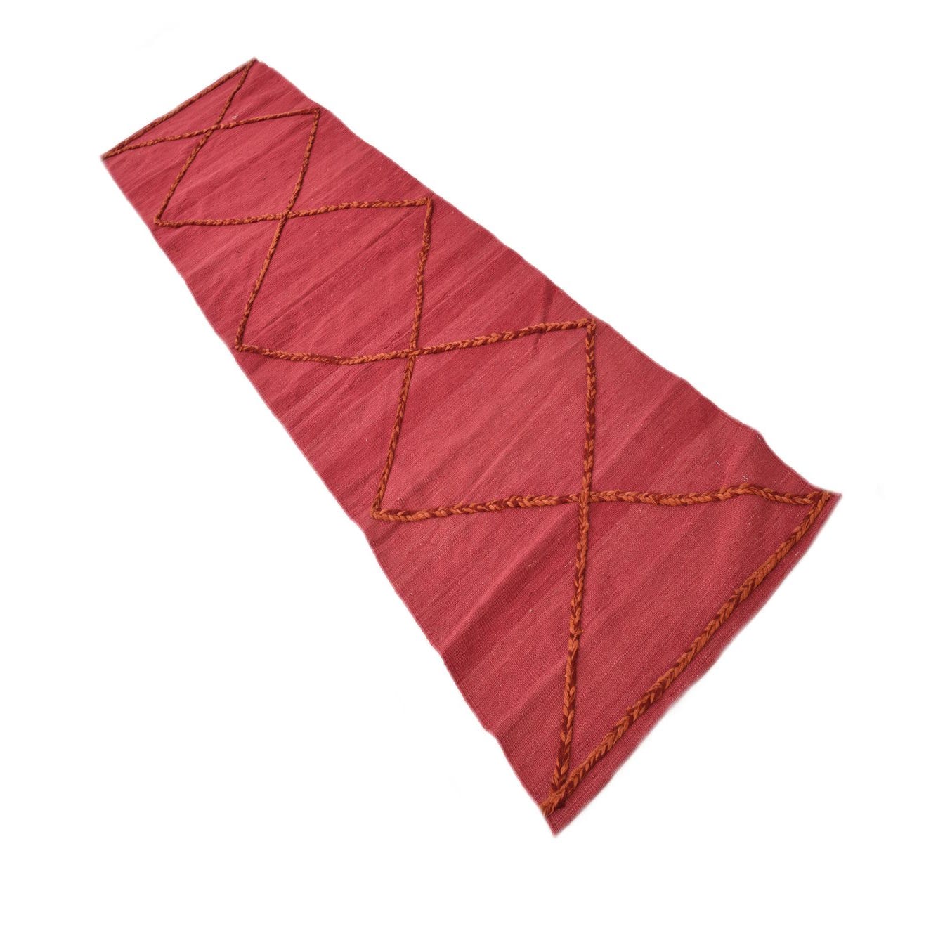 A 10 ft red wool runner rug with a flatweave texture and a braided tribal diamond pattern.