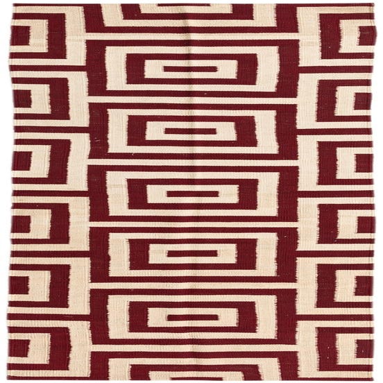 A 10 ft runner rug with a bold tribal geometric pattern in red and cream, ideal for a hallway.
