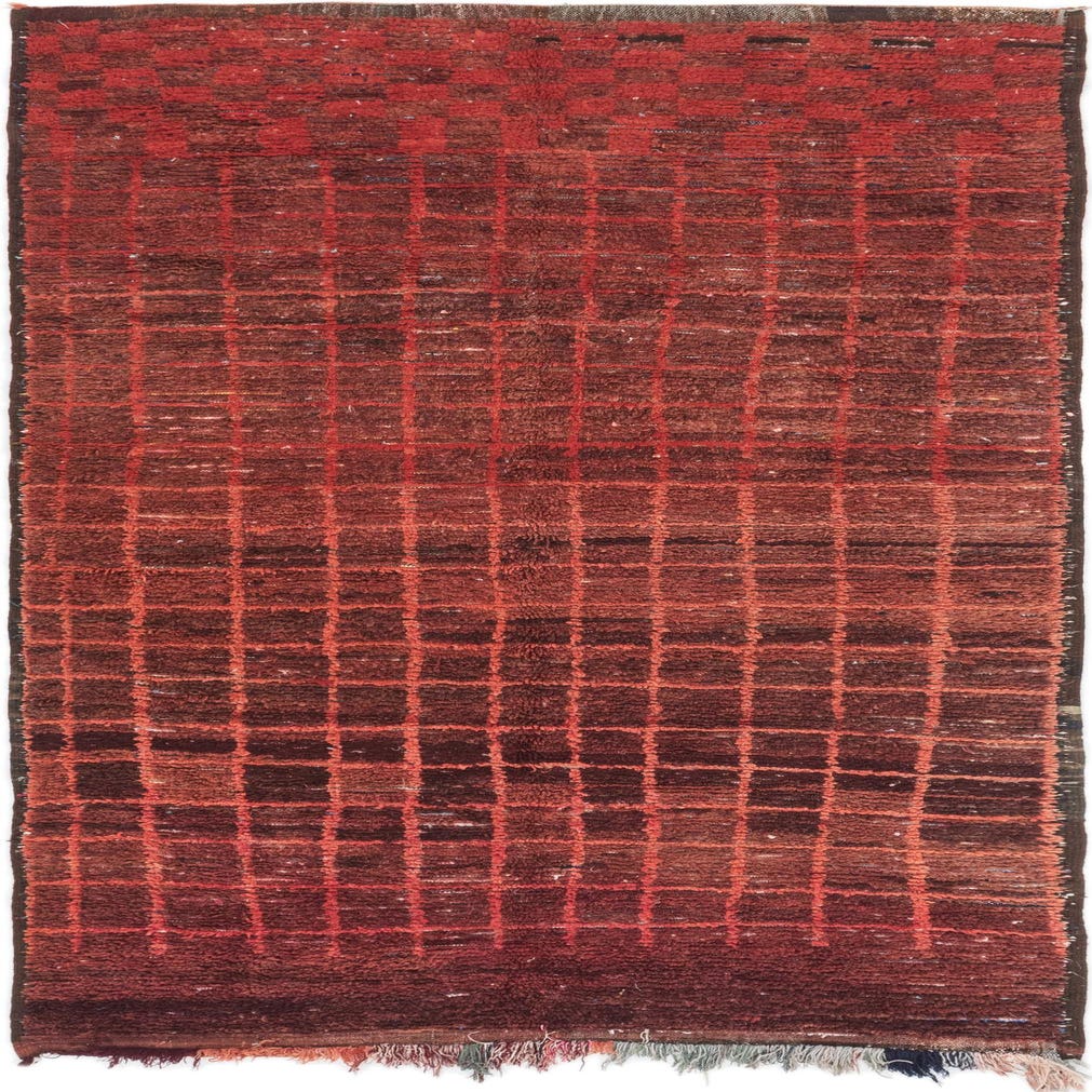 Hand-knotted from 100% wool, this runner features a tight grid of small squares formed by rust-red and peach lines on a deep burgundy ground. The handwork creates subtle variations in tone and an organic, slightly irregular geometry that adds character without feeling busy. Underfoot the pile is dense and plush with a nubby, tactile surface and short finished fringes at the ends.