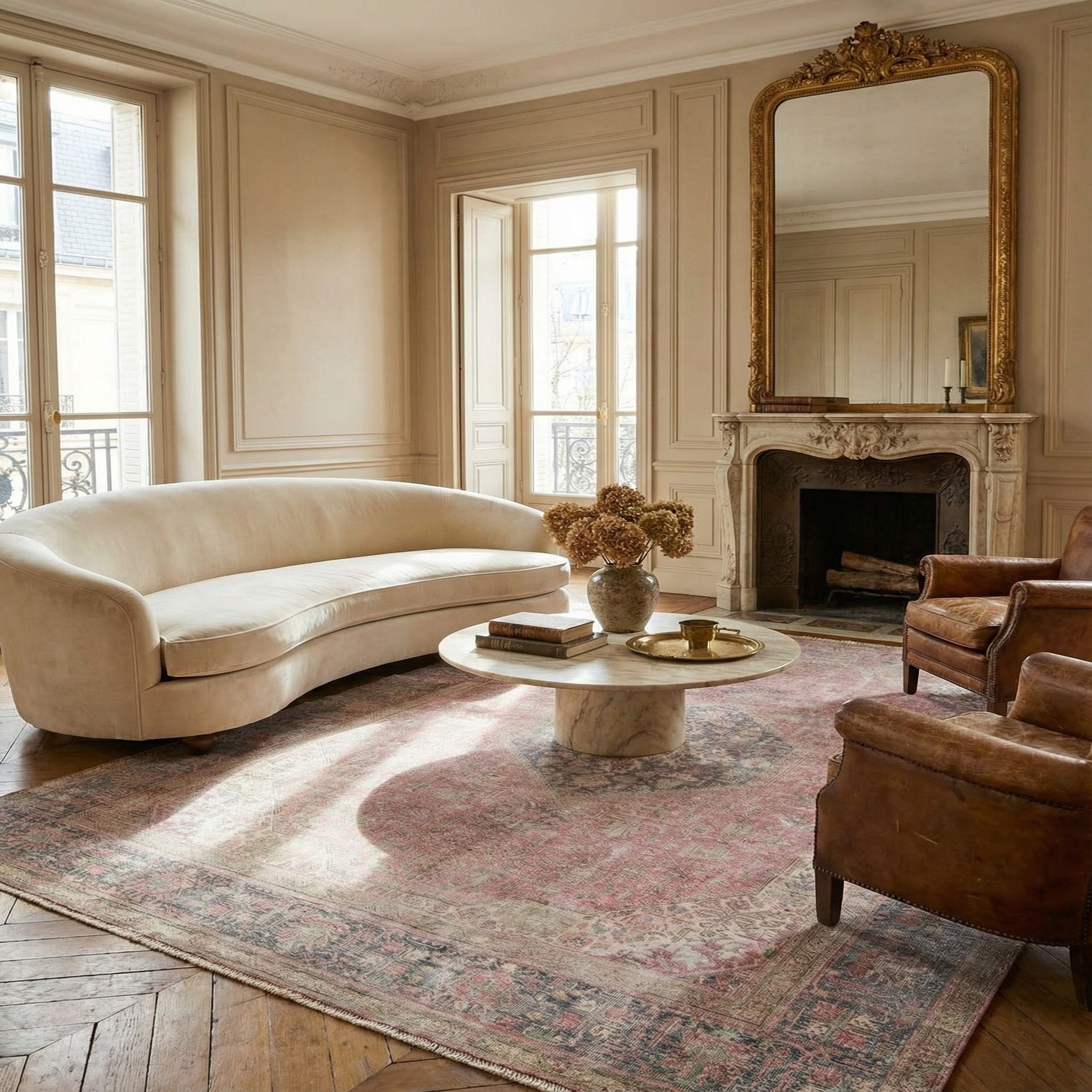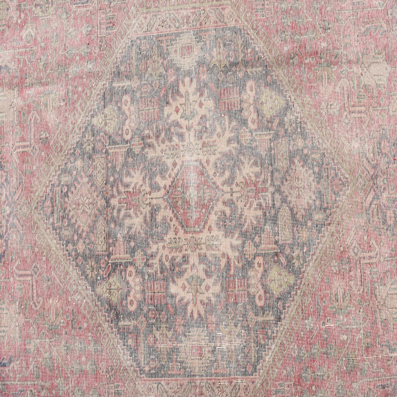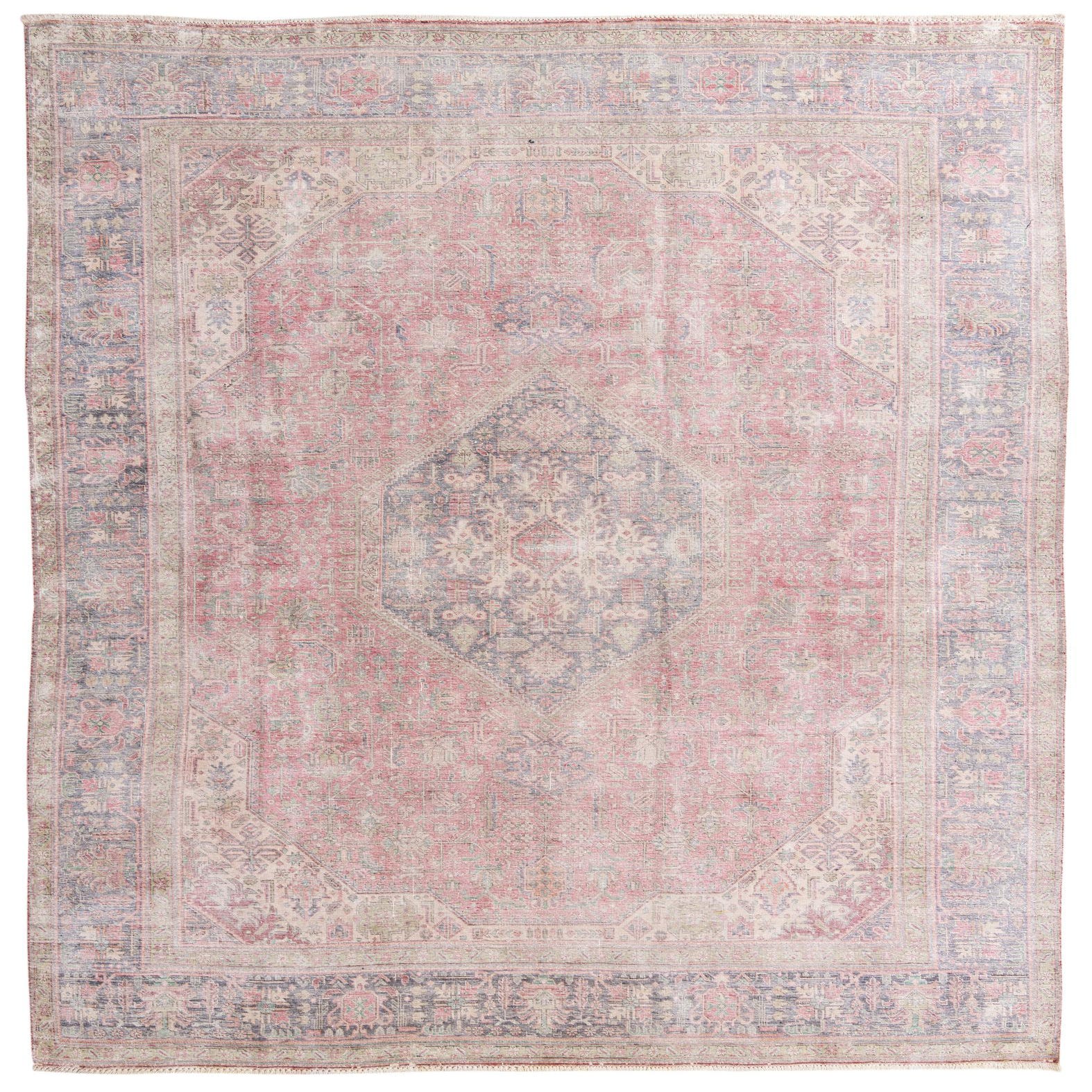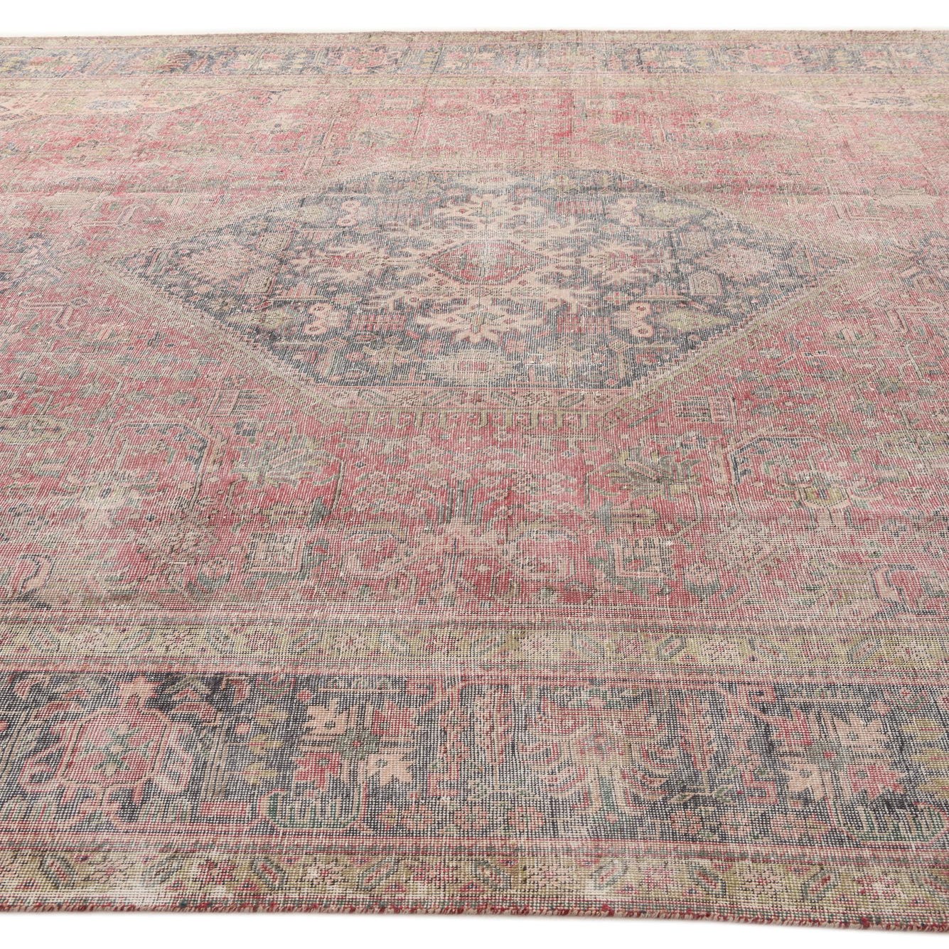 A large 10x12 rectangular Ultra Vintage Persian rug in faded reds and blues, showcasing an intricate medallion pattern.