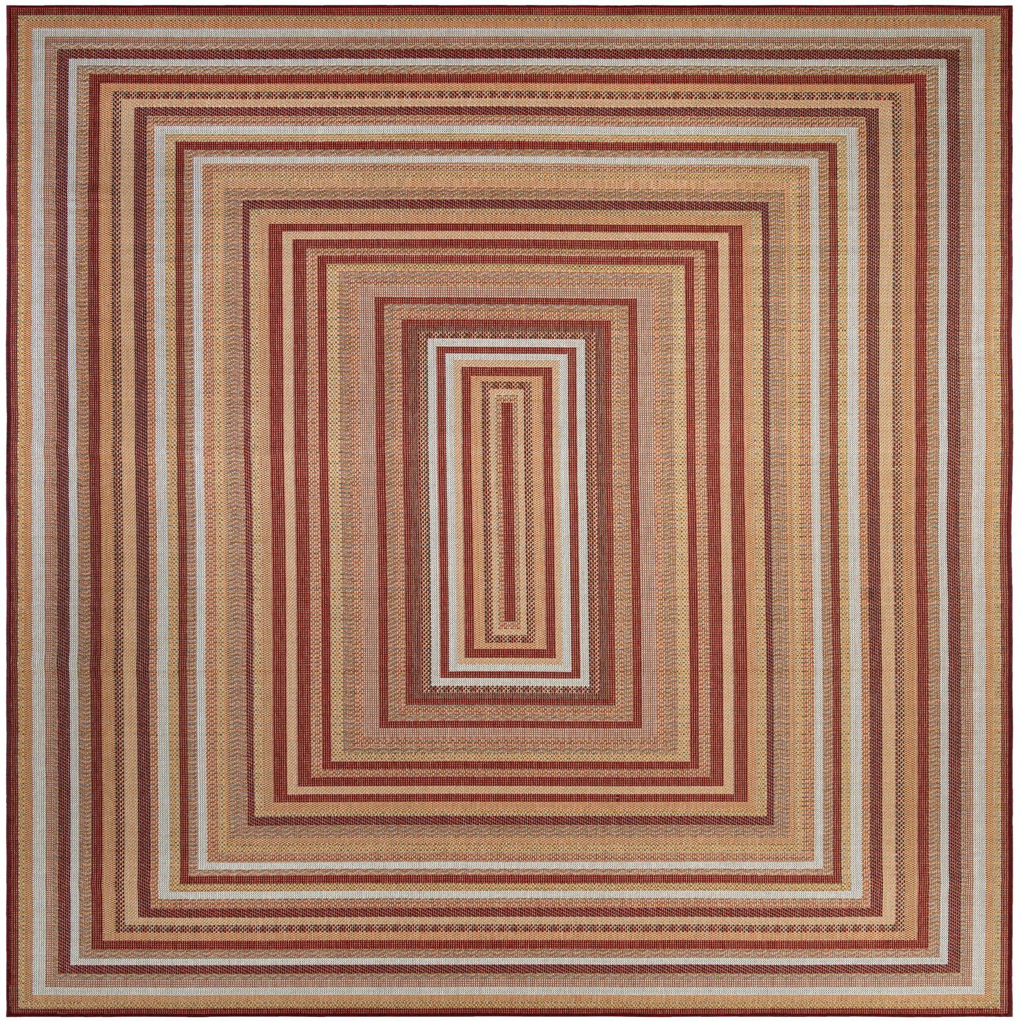 A bold, geometric stripe design forms a series of nested rectangles across a rich burgundy background. Narrow and wider bands of blue, green, ivory and orange alternate to create a structured, almost architectural pattern that catches the eye without overwhelming a space. The surface is a low-profile flatweave with a subtle braided texture you can feel underfoot—tightly woven and slightly coarse to the touch, giving a casual, tactile quality that holds up to frequent use.
