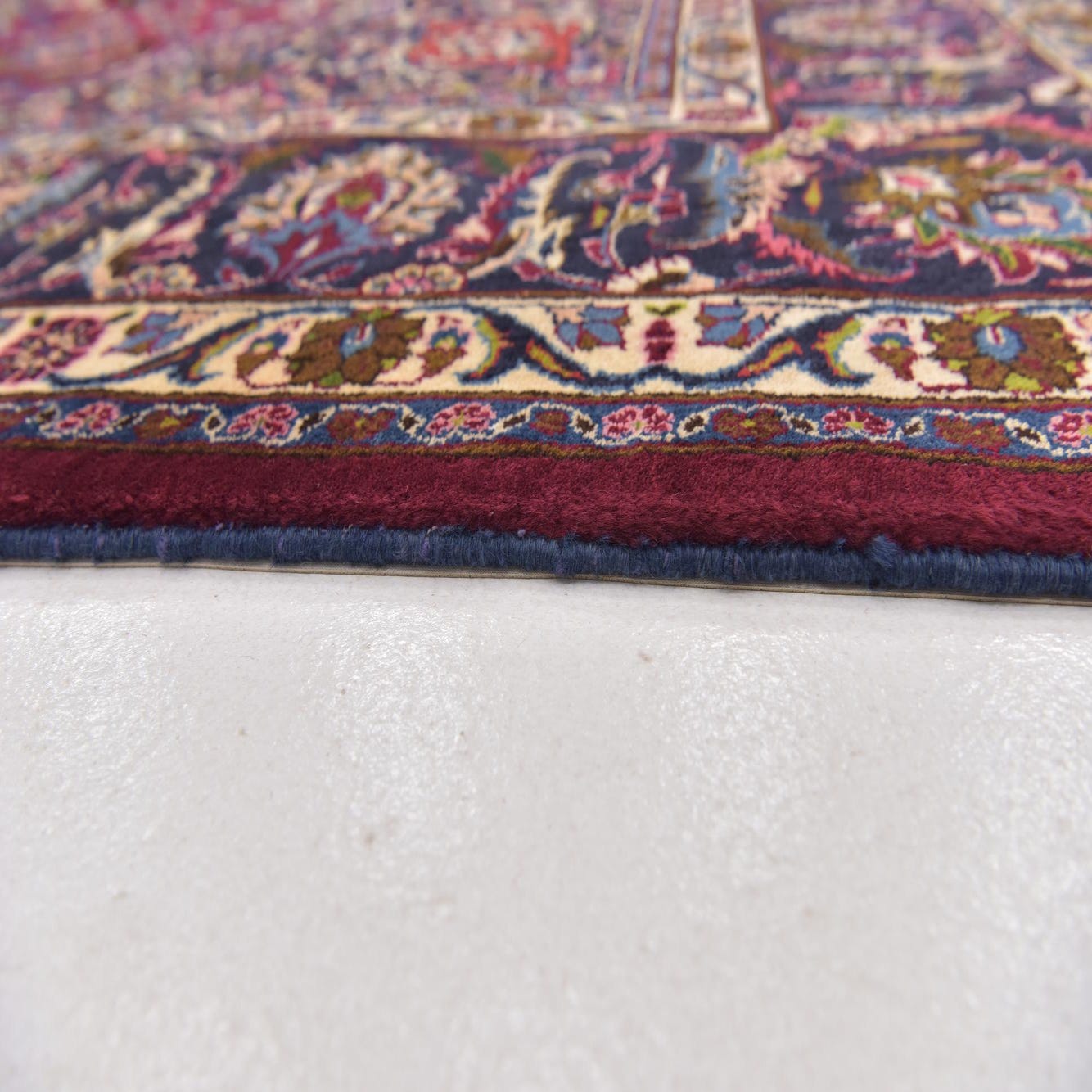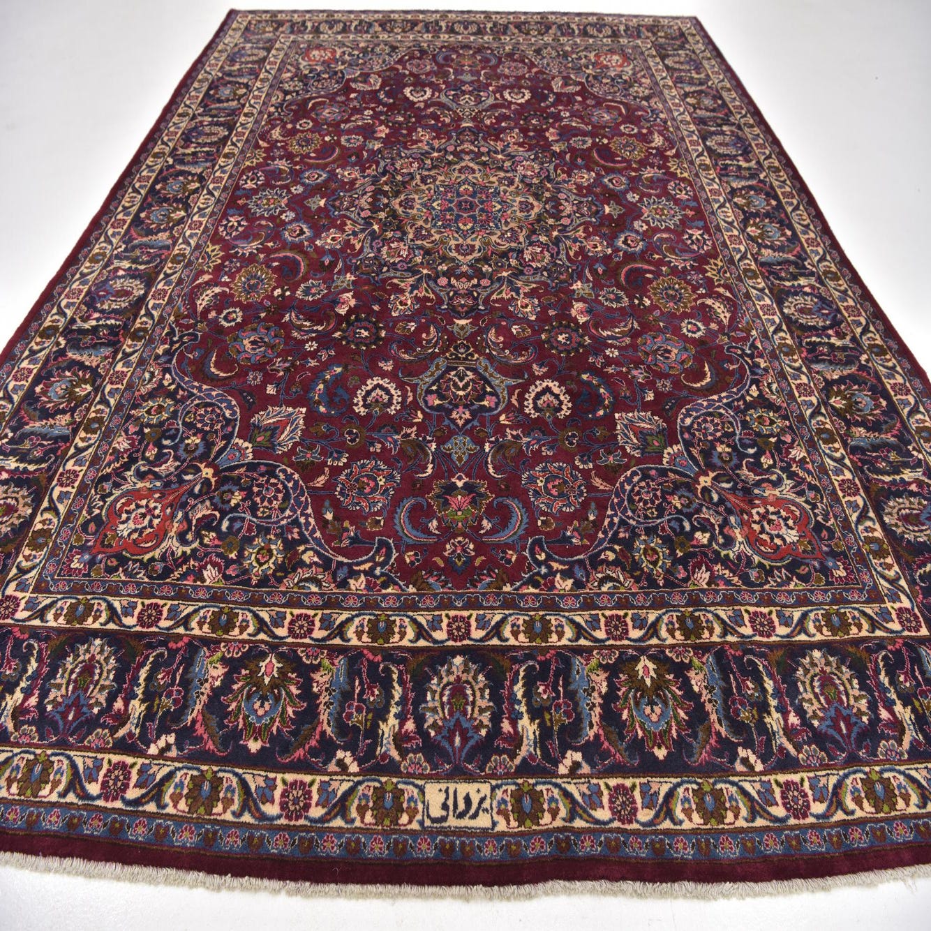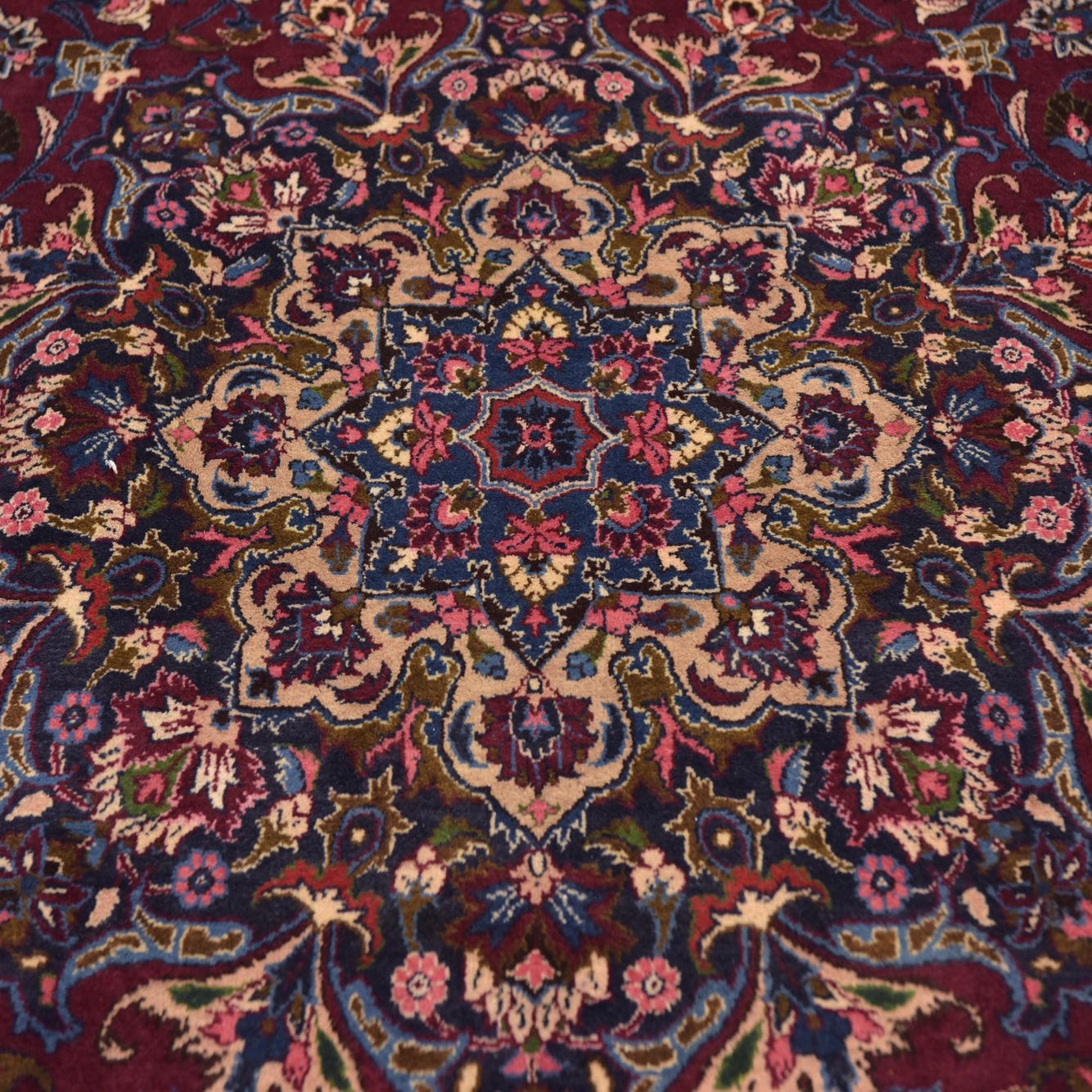 The Birjand collection offers a 10x13 hand-knotted rug crafted from 100% wool, delivering a refined statement of longevity and artisanal craftsmanship. The rug features a rich burgundy background, thoughtfully complemented by an assortment of colors including black, blue, green, ivory, navy blue, olive, peach, pink. These hues come together to form an intricate, traditional pattern reminiscent of classic Persian designs. The density of the pattern provides a visual feast of florals and ornate motifs that invite closer inspection and appreciation.
