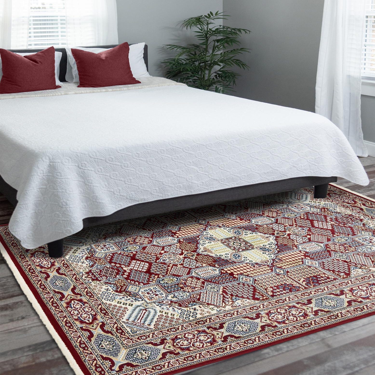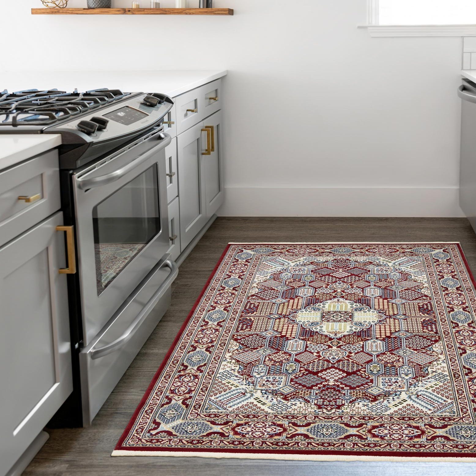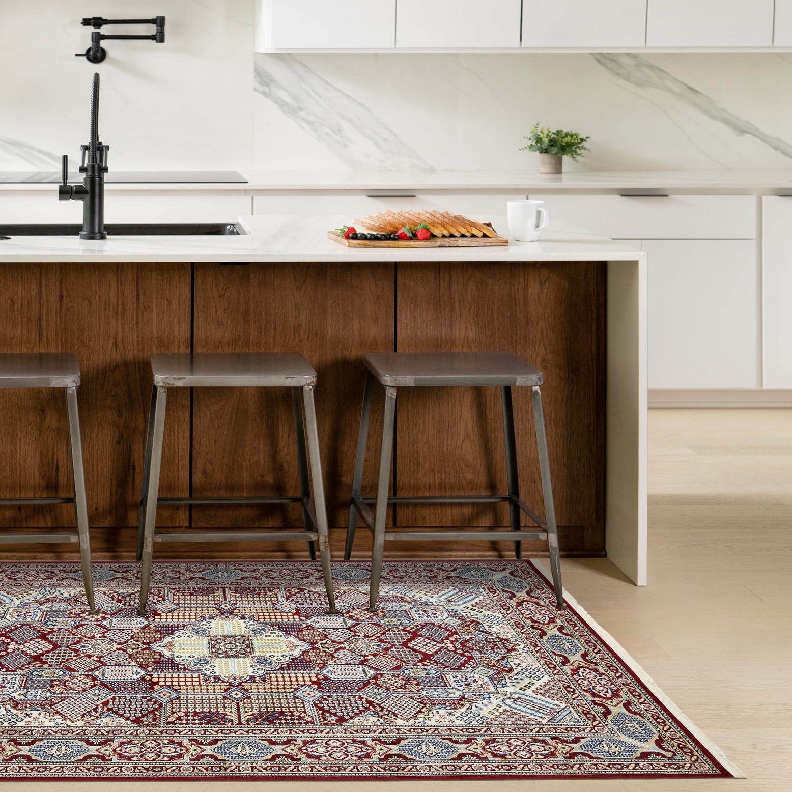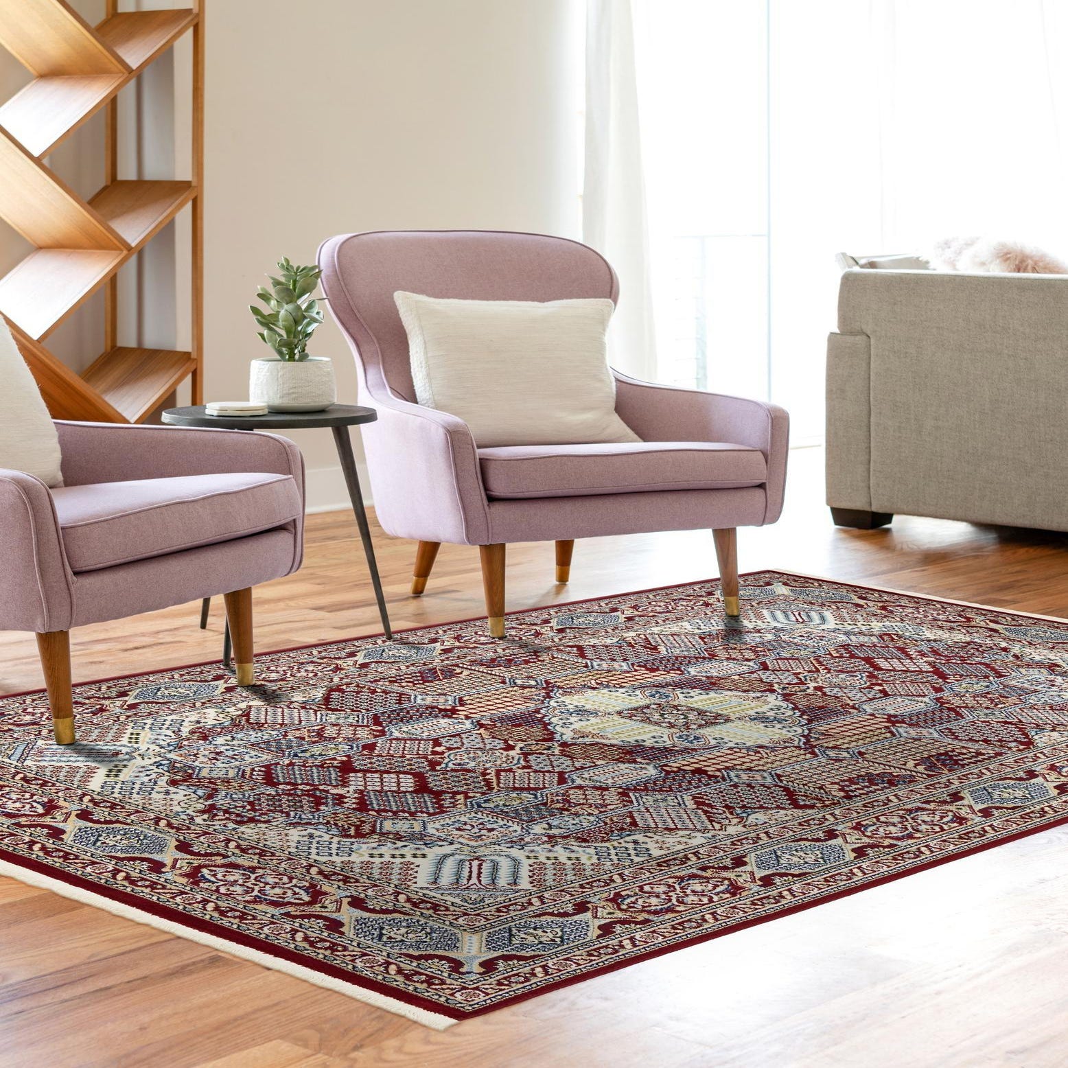 Primary color is Burgundy. Colors in this rug include: Burgundy, Beige, Blue, Cream, Green, Ivory, Navy Blue, Puce.