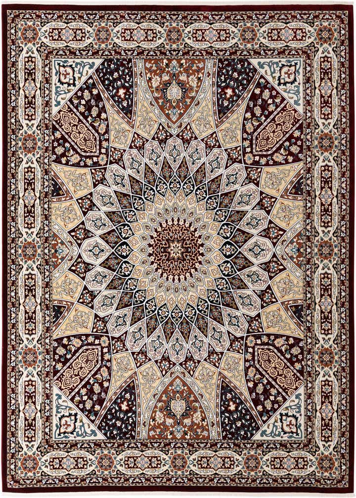 A classic medallion layout fills the field with a radiating starburst of petal-like motifs that step outward into ornate corner spandrels and layered borders. The burgundy background creates a warm, grounded field while cream and ivory outlines bring crisp definition to the floral arabesques; navy and lighter blues add cool contrast and small touches of green, puce and salmon introduce subtle warm highlights. Machine-made from 85% polypropylene and 15% polyester, the rug has a low-profile, tightly woven pile that feels smooth and slightly cushioned underfoot while keeping the intricate pattern sharply defined.