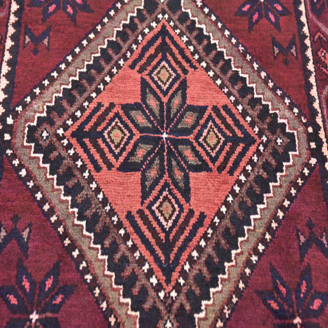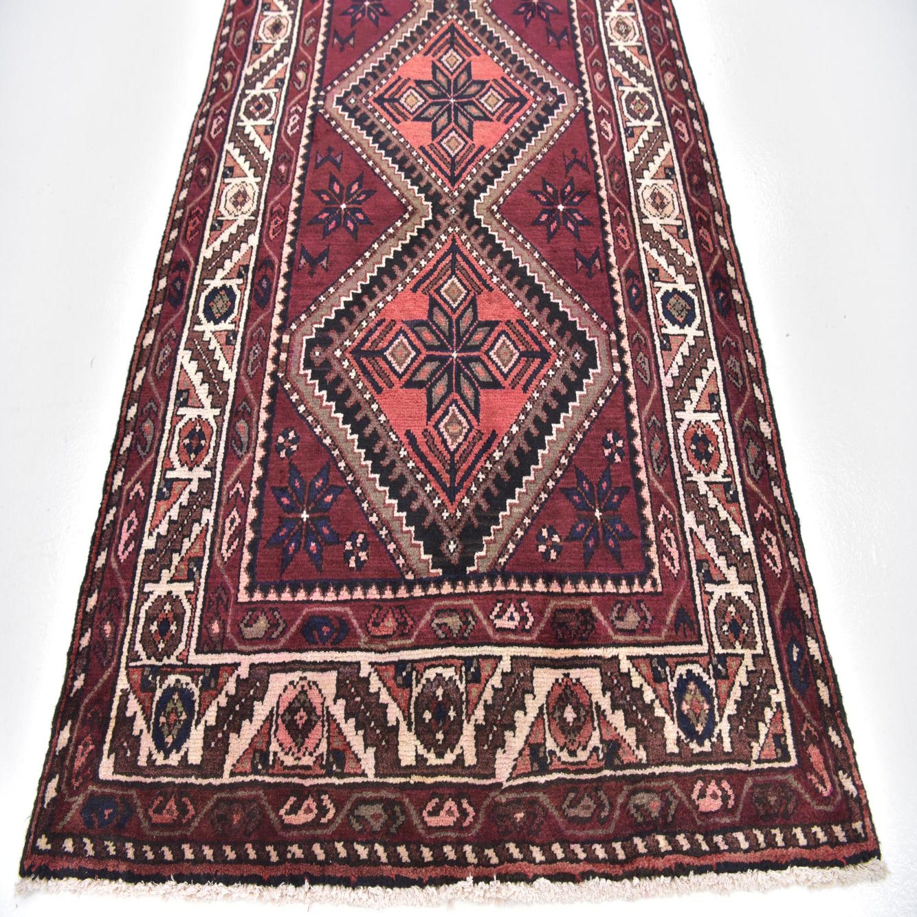 The Chenar Collection presents a hand-knotted 100% wool 11 Ft Runner that showcases a rich burgundy base. This semi-antique rug, aged between 40 to 60 years, features a pattern composed of geometric and diamond shapes, bordered by intricate decorative motifs. Additional coloration weaves through the pattern with hues of beige, black, brown, ivory, and peach, creating a harmonious, traditional aesthetic.
