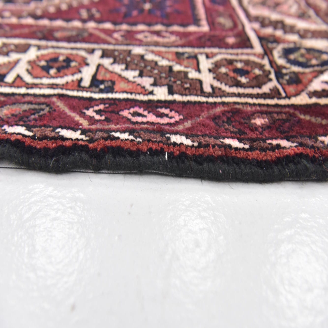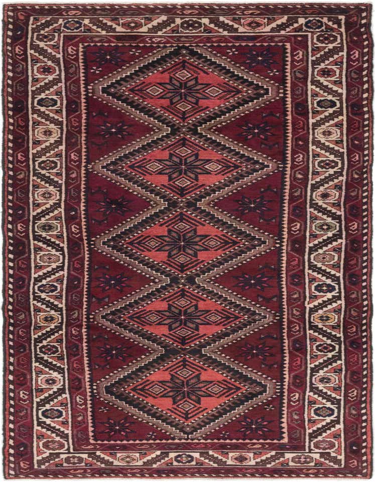 Primary color is Burgundy. Colors in this rug include: Burgundy, Beige, Black, Brown, Ivory, Peach.