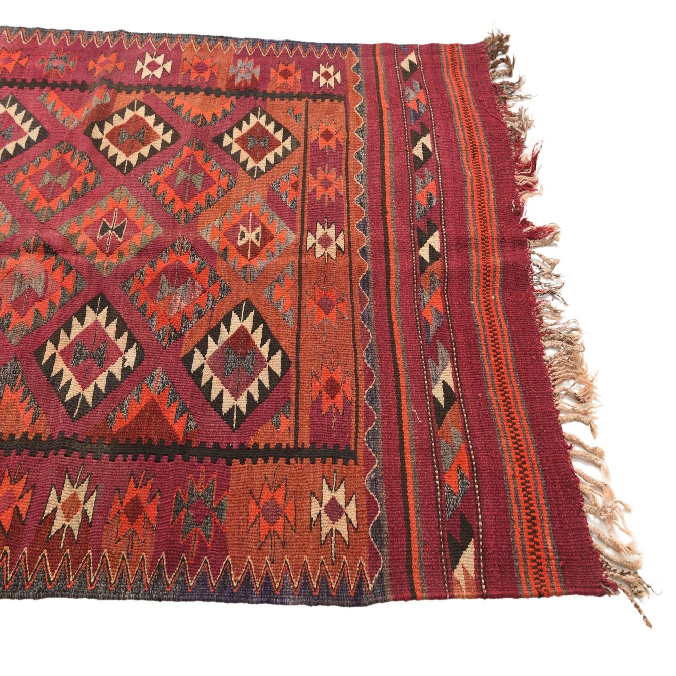 A long, flatweave Kilim Fars runner rug in rich reds, oranges, and black with a tribal geometric diamond pattern, suitable for a hallway.