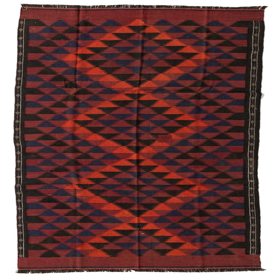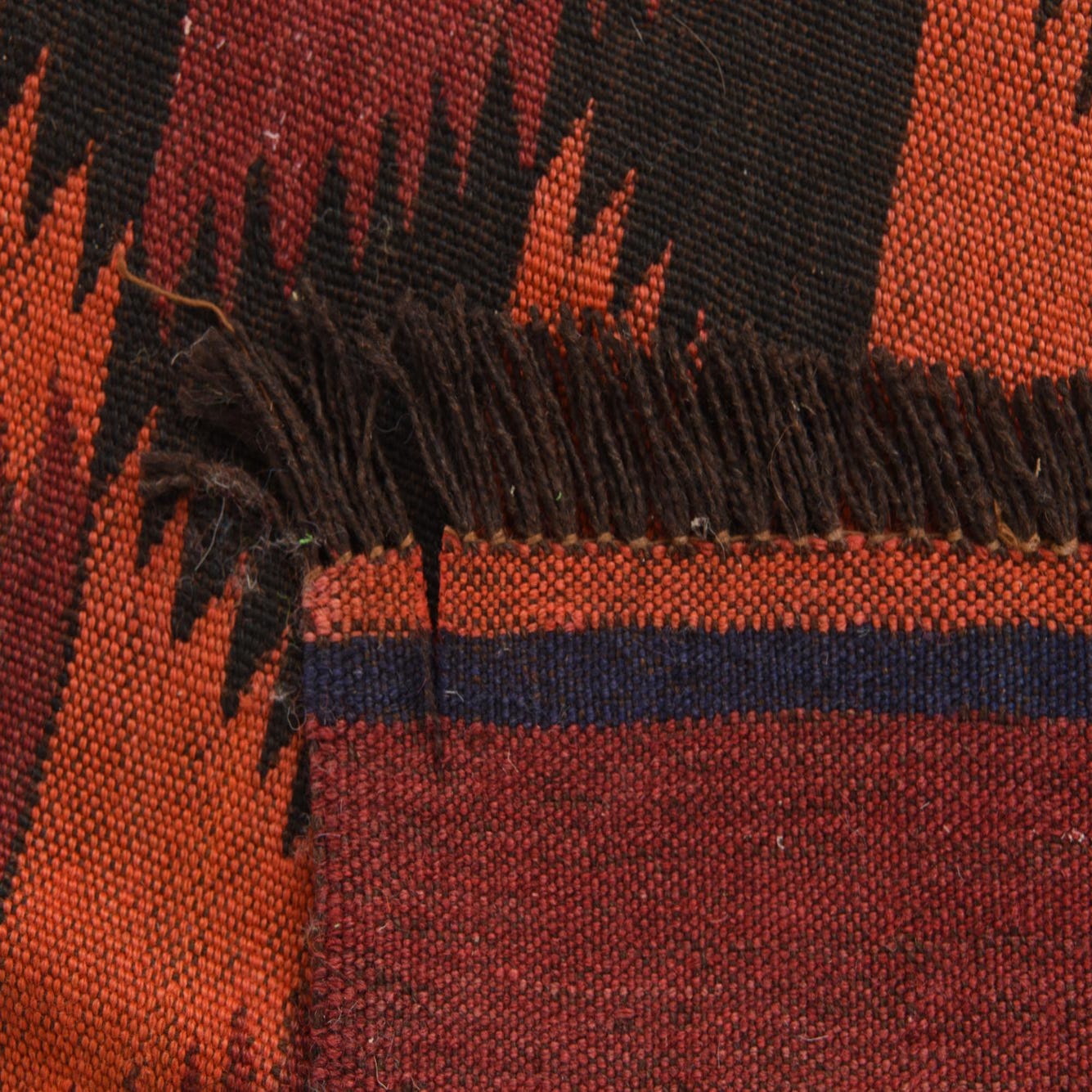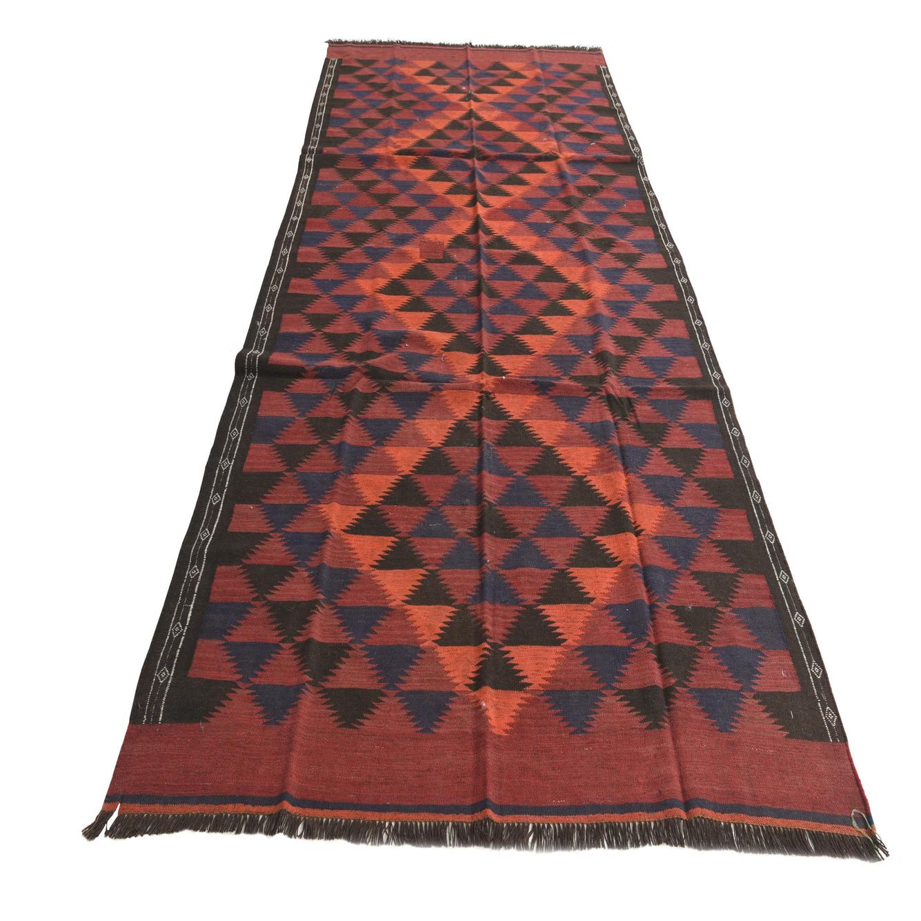 A handmade 11 ft Kilim Fars runner rug in red, black, and navy, featuring a tribal geometric pattern of interlocking triangles.