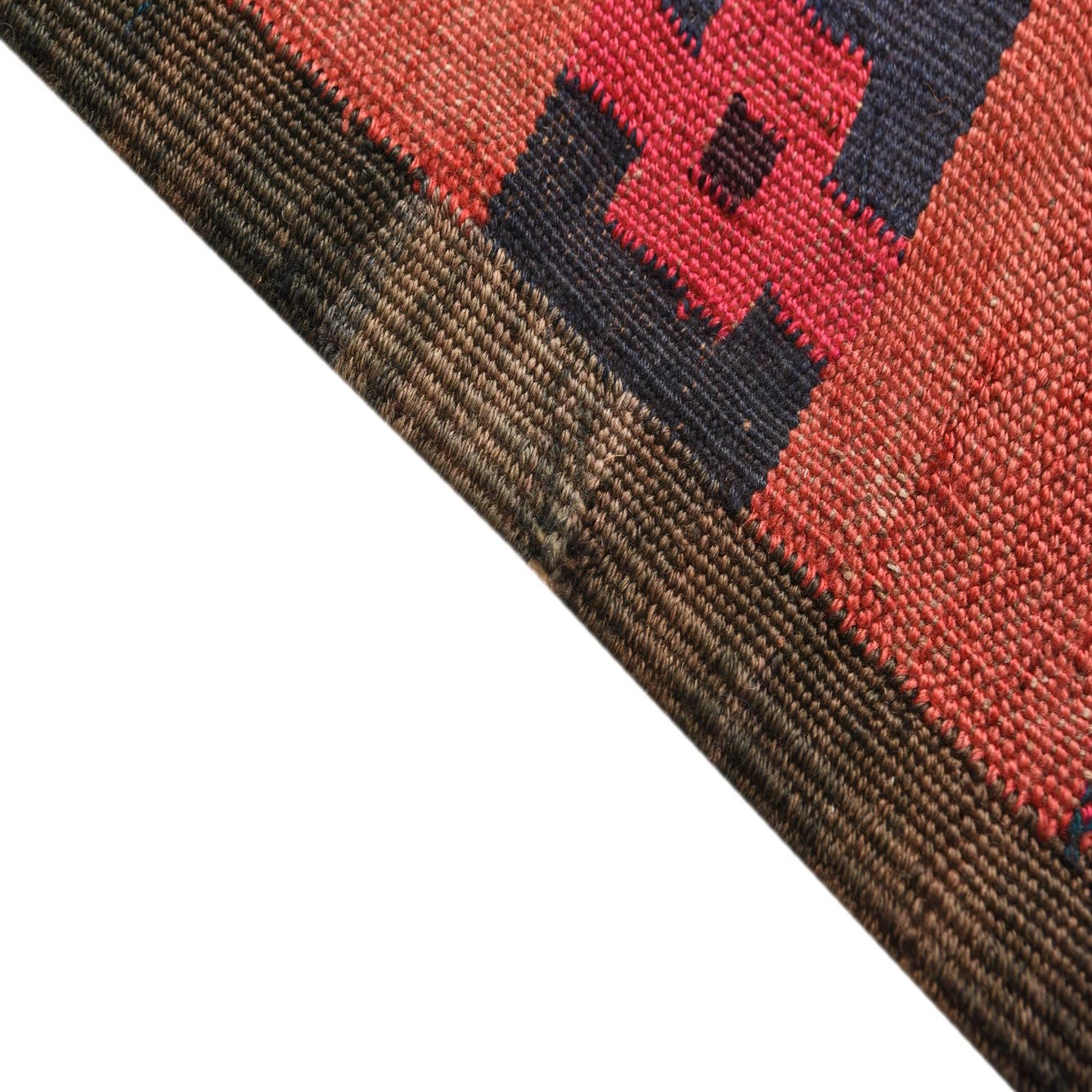 The rug's texture is indicative of traditional kilim craftsmanship, which is highlighted by a flatweave construction that gives it a lightweight yet durable character. With a semi-antique age of 40-60 years, the runner boasts a matured beauty that brings depth to its color spectrum and adds a layer of historical charm to its presence.