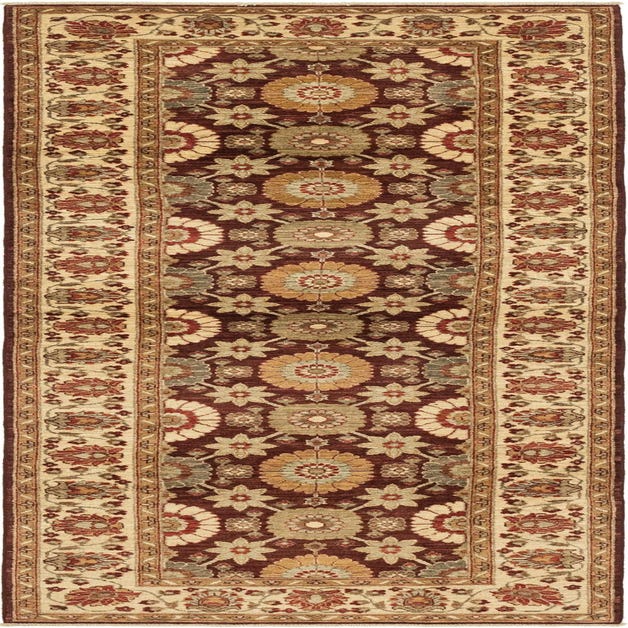 Primary color is Burgundy. Colors in this rug include: Burgundy, Beige, Brown, Cream, Light Brown, Light Green, Olive, Peach.